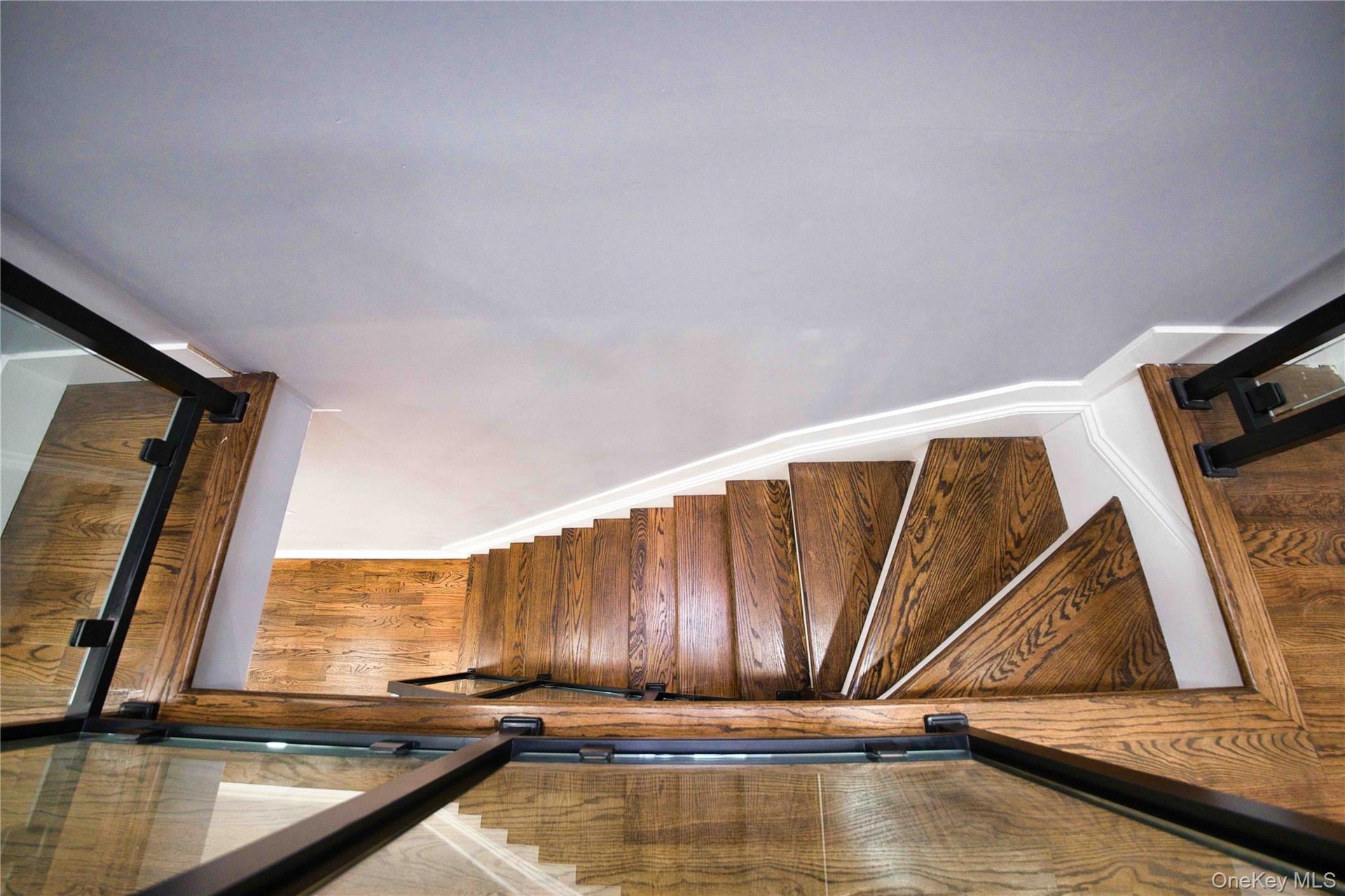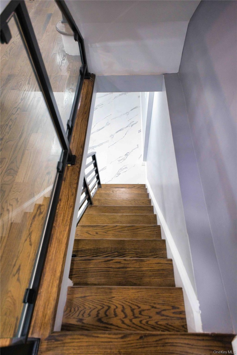 - Finished basement featuring stairway, light marble finish flooring, and recessed lighting