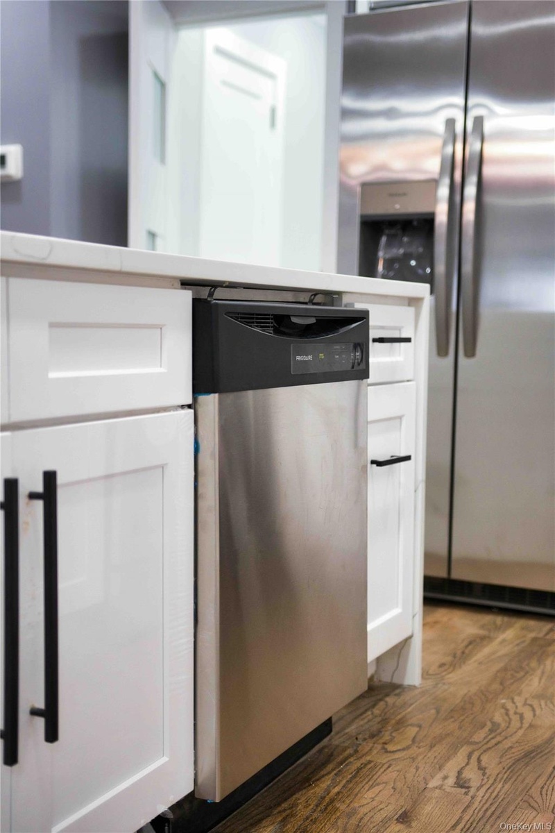 - Kitchen featuring appliances with stainless steel finishes, white cabinets, and dark wood-type flooring