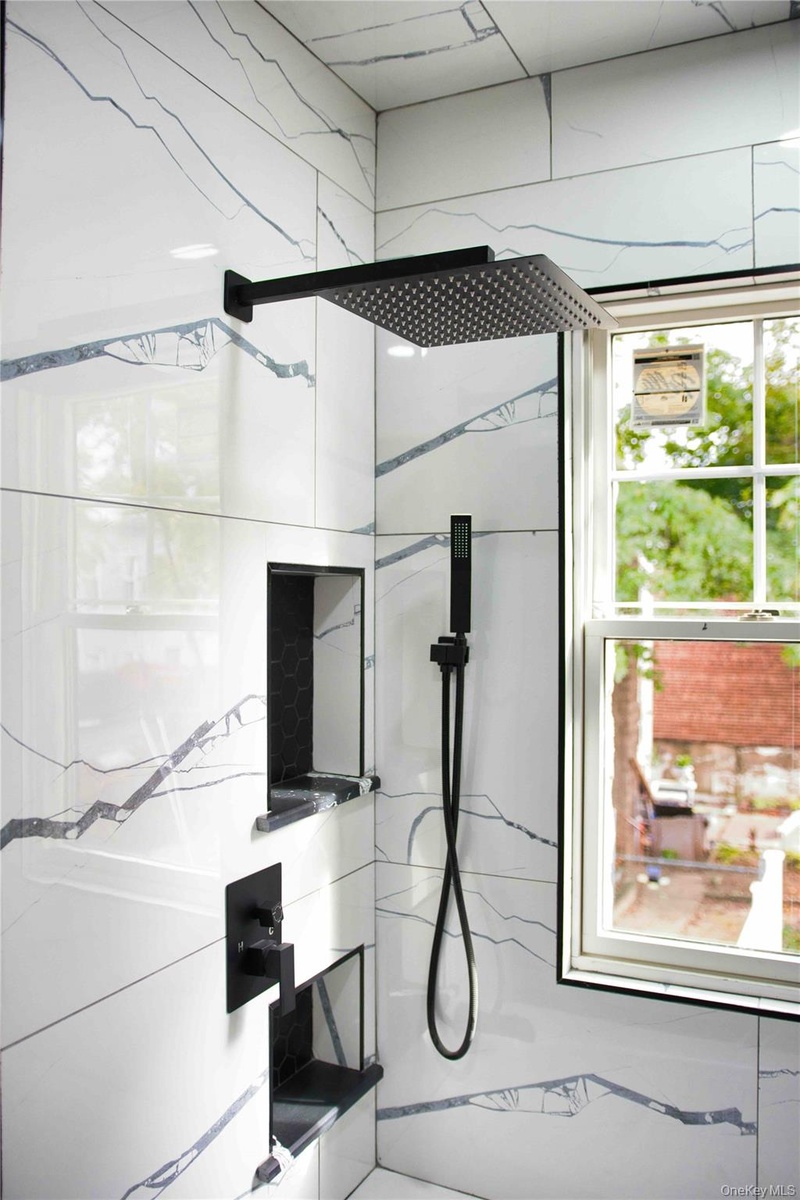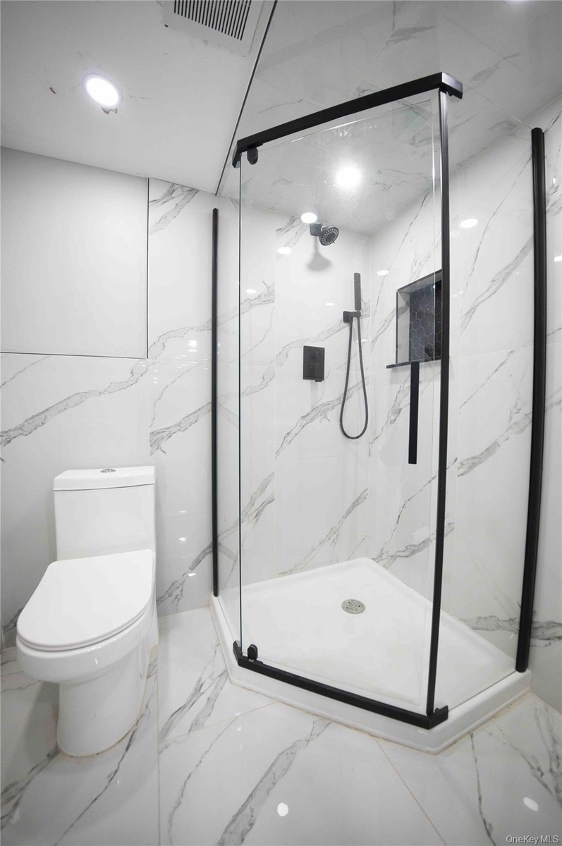 - Bathroom featuring a marble finish shower, marble tiled flooring, stone wall, and recessed lighting