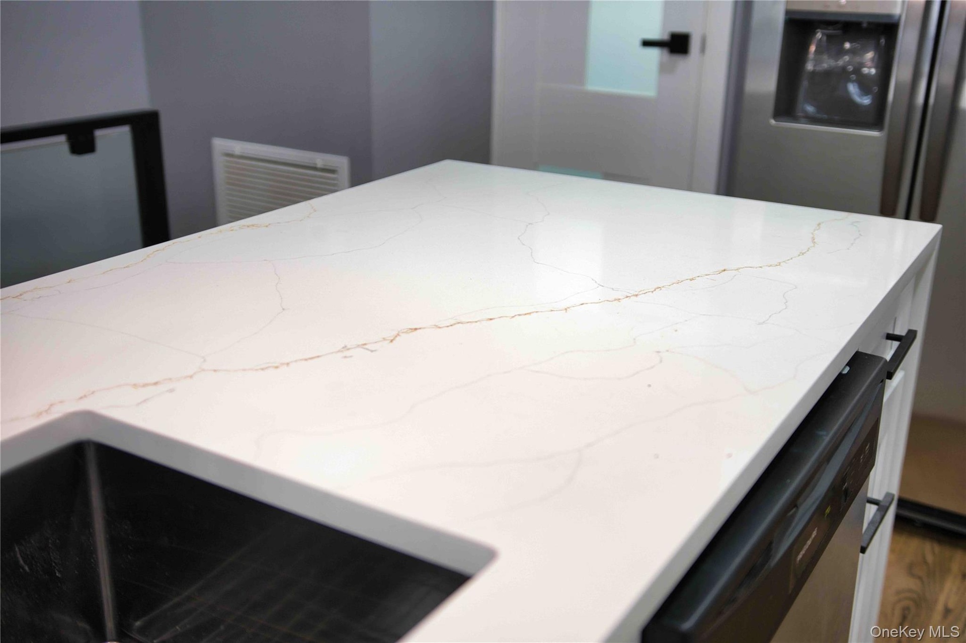 - Kitchen view of light stone countertops and appliances with stainless steel finishes