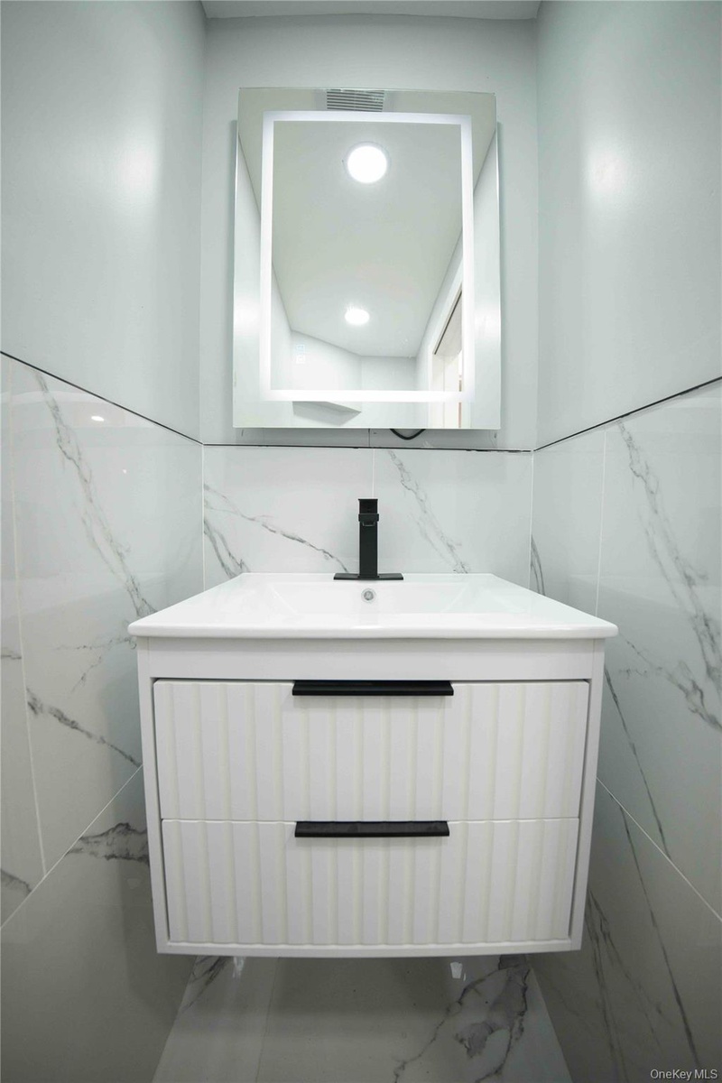 - Bathroom featuring tile walls, a combined bath / shower with marble appearance, vanity, and marble tiled floors