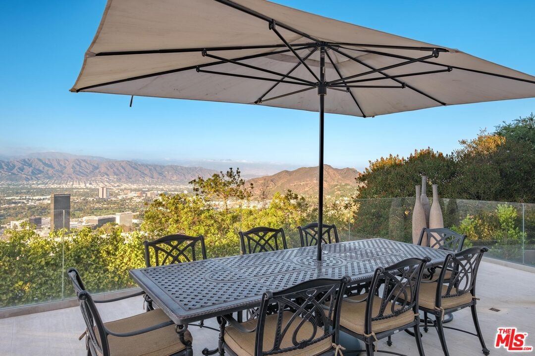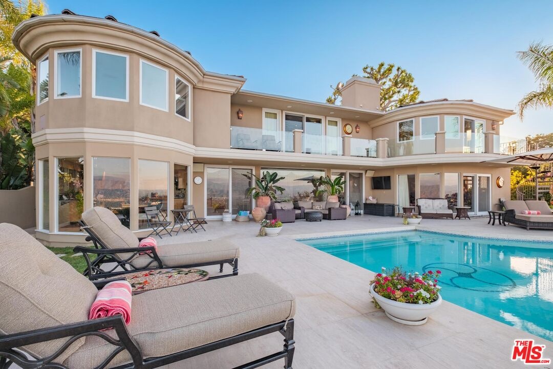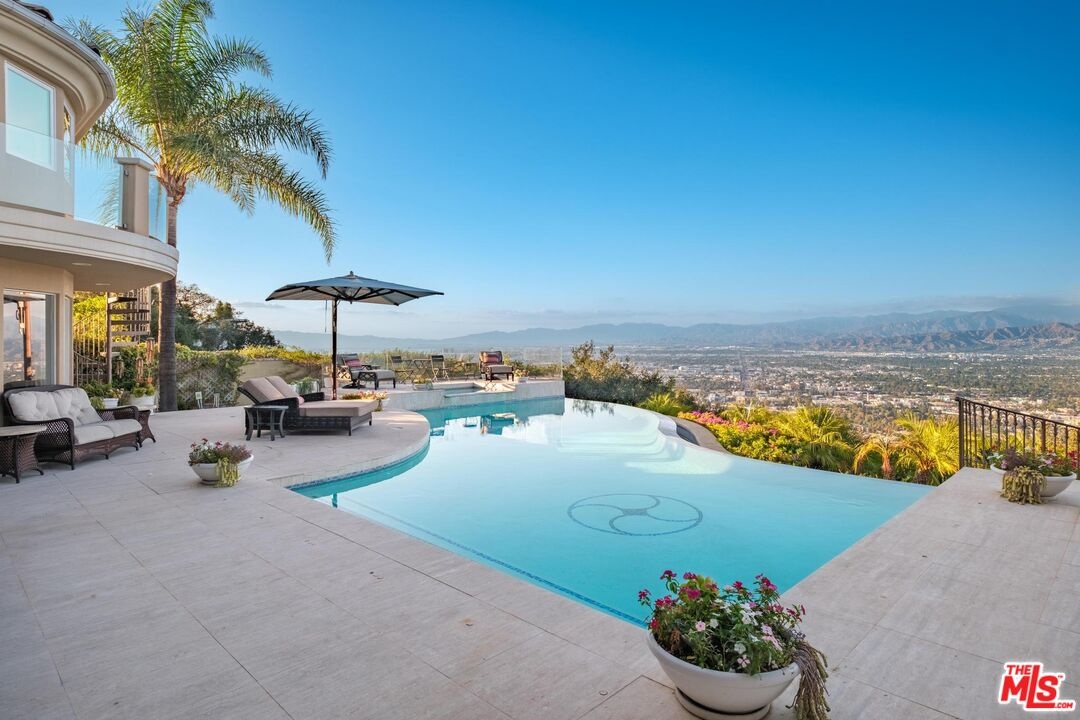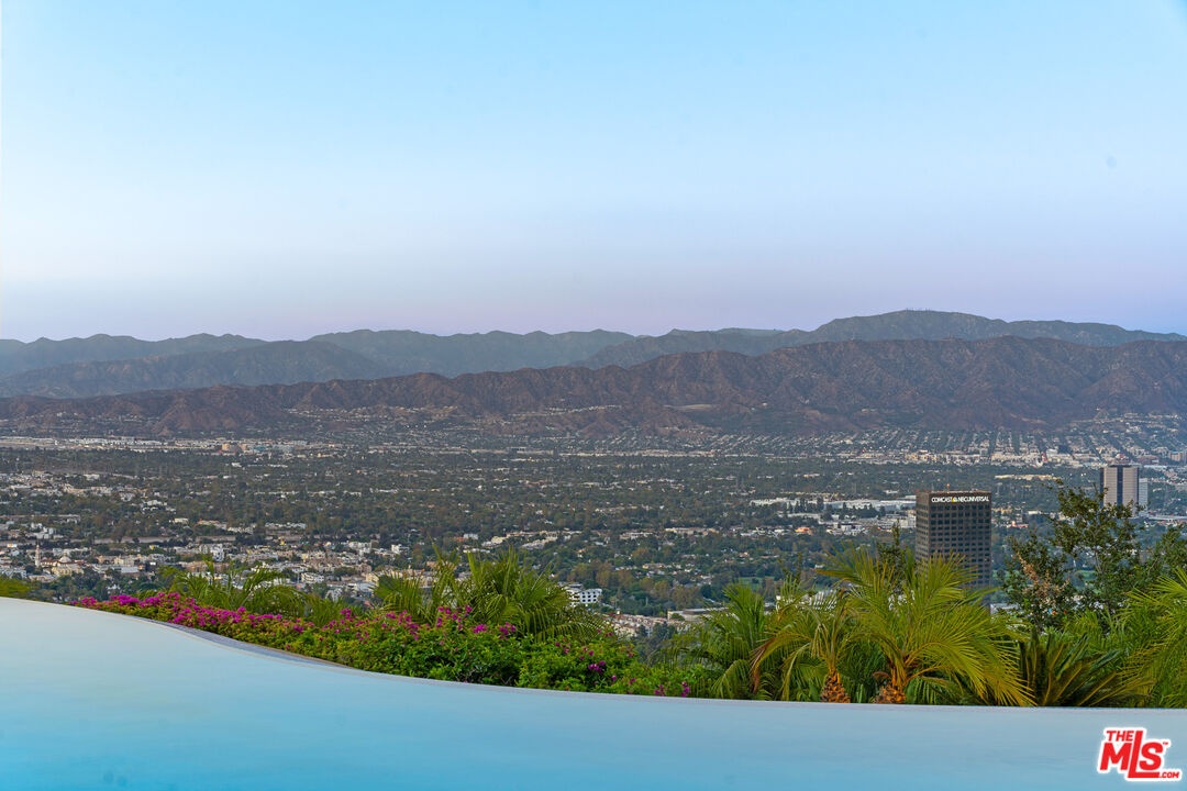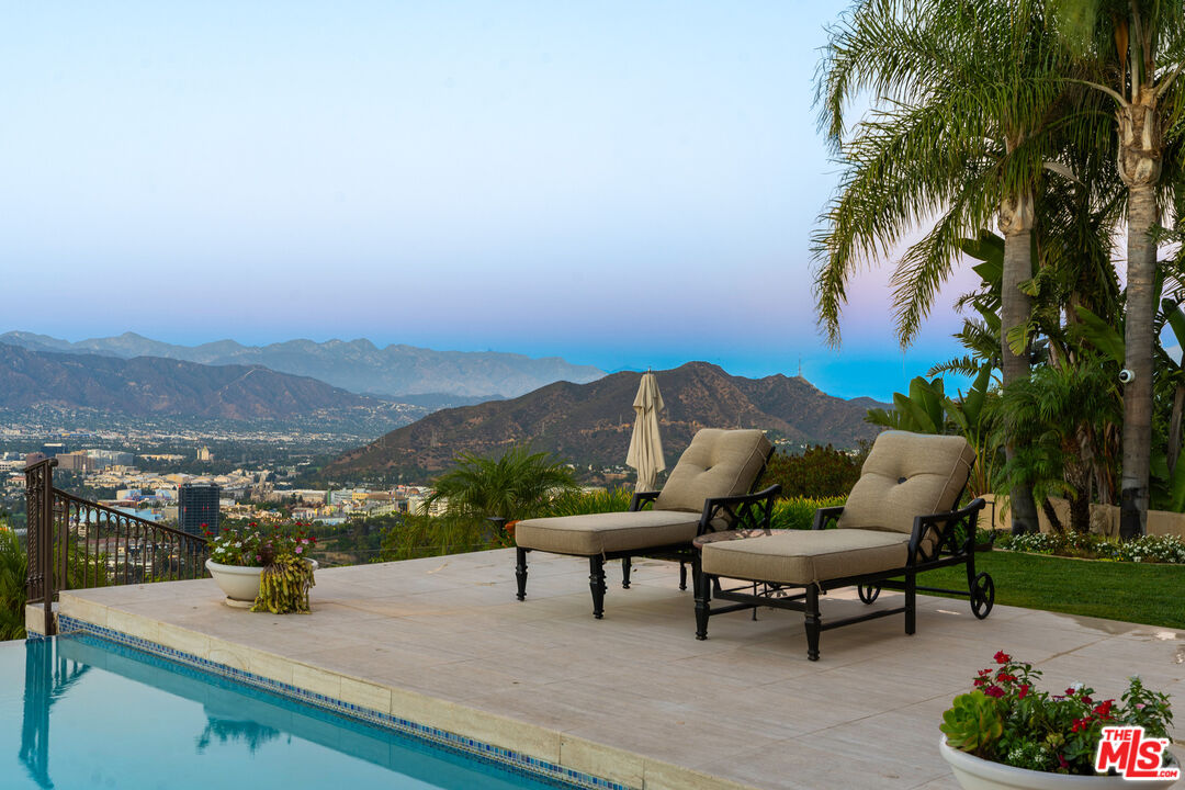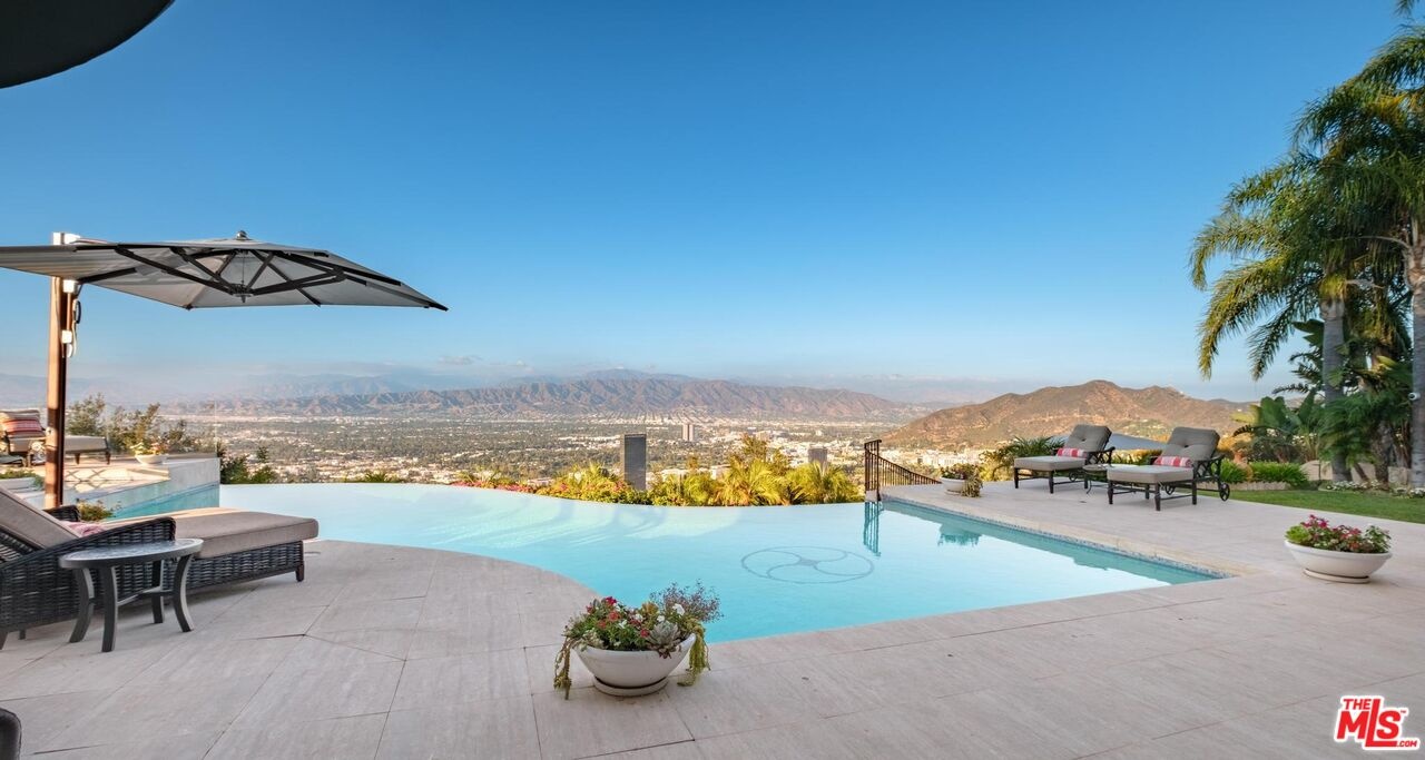 Welcome to "Villa De Torreyson", a breathtaking Mediterranean masterpiece perched high above the Hollywood Hills on one of the most prestigious celebrity-studded cul-de-sacs in Hollywood Hills West. This timeless villa captures inarguably the most awe-inspiring, unobstructed panoramic views in the entire region sweeping from the Santa Monica Mountains and Universal Studios to the vast San Fernando Valley skyline and mountain ranges. With a commanding promontory position and cinematic sunrises and sunsets, this is a rare offering for those who demand the extraordinary. Beyond its stately motor court and dramatic two-story entry, the residence unfolds into a series of radiant, light-filled living spaces that embody the elegance of Old World Mediterranean charm fused with refined California luxury. The formal living room flows effortlessly into the dining room, breakfast nook, and a spacious chef's kitchen, creating the perfect atmosphere for both grand-scale entertaining and intimate everyday living. Step outside to a resort-inspired oasis where an architectural infinity pool floats above the city, framed by lush landscaping, multiple lounging terraces, and a built-in BBQ pavilion, all oriented to capture the home's world-class views at every turn. The primary suite is a sanctuary unto itself, featuring a cozy sitting area with fireplace, dual walk-in closets, and a private wraparound balcony that spills directly into the horizon. A spa-like bath with soaking tub and oversized glass shower completes the retreat with a sense of calm sophistication. Additional highlights include a state-of-the-art home theater with projection system and surround sound, a bonus room with private entrance ideal for a gym, office, recording studio, meditation/yoga area, or creative studio, a three-car garage, and five luxurious en-suite bedrooms. With effortless access to the Sunset Strip, Beverly Hills, and Studio City, "Villa De Torreyson" is more than a home, it is a rarefied hilltop estate that defines prestige, privacy, and iconic Los Angeles living. Truly one of the best views in all of Hollywood Hills West.