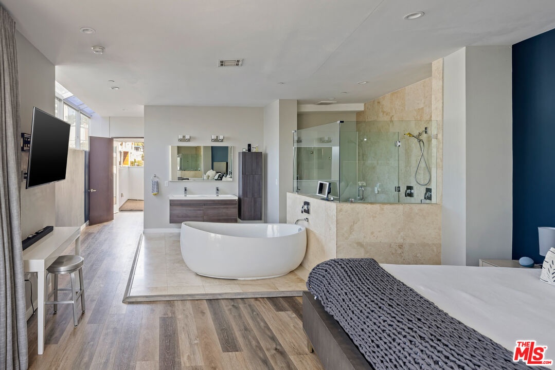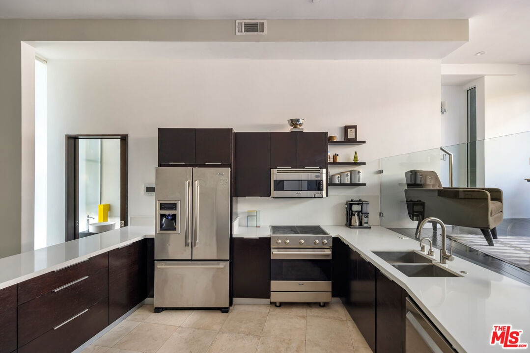 Striking Architectural Modern Townhome - Ideally located in the most desirable area of West Hollywood. The residence features open concept living areas with essential outdoor flow and creative spaces that allow for a flexible use for an owner to customize their living experience with convertible bedrooms to offices, media rooms, etc. The direct-entry first level features; kitchen with custom cabinets, stainless appliances, quartz countertops and travertine tile flooring. An entry, living room and dining area are light filled with a retractable wall of glass that opens to an alfresco dining patio. A powder room and dark hardwood flooring throughout. The second level consists of two guest rooms, two baths, laundry closet, and a small balcony. The primary bedroom suite occupies the entire upper level with incredible spa-style open-concept bath with dual vanity, glass shower, soaking tub, and dual closets. A spacious private rooftop deck offers amazing 360 degree views encompassing vistas from downtown LA to the westside, landmarks and the Hollywood hills. A built-in barbecue kitchen area, and lounge areas are perfect for entertaining or simply relaxing in the sunshine. Central air and heat, secure access, 2-car gated parking garage with storage. Ideally located between the famous Sunset and Santa Monica boulevards, steps to the Sunset Strip; luxe shopping, cafes, grocery, nightlife, top restaurants. Zoned for the prestigious West Hollywood Elementary. Only two-units are in the building making this a rare opportunity with low HOA dues.