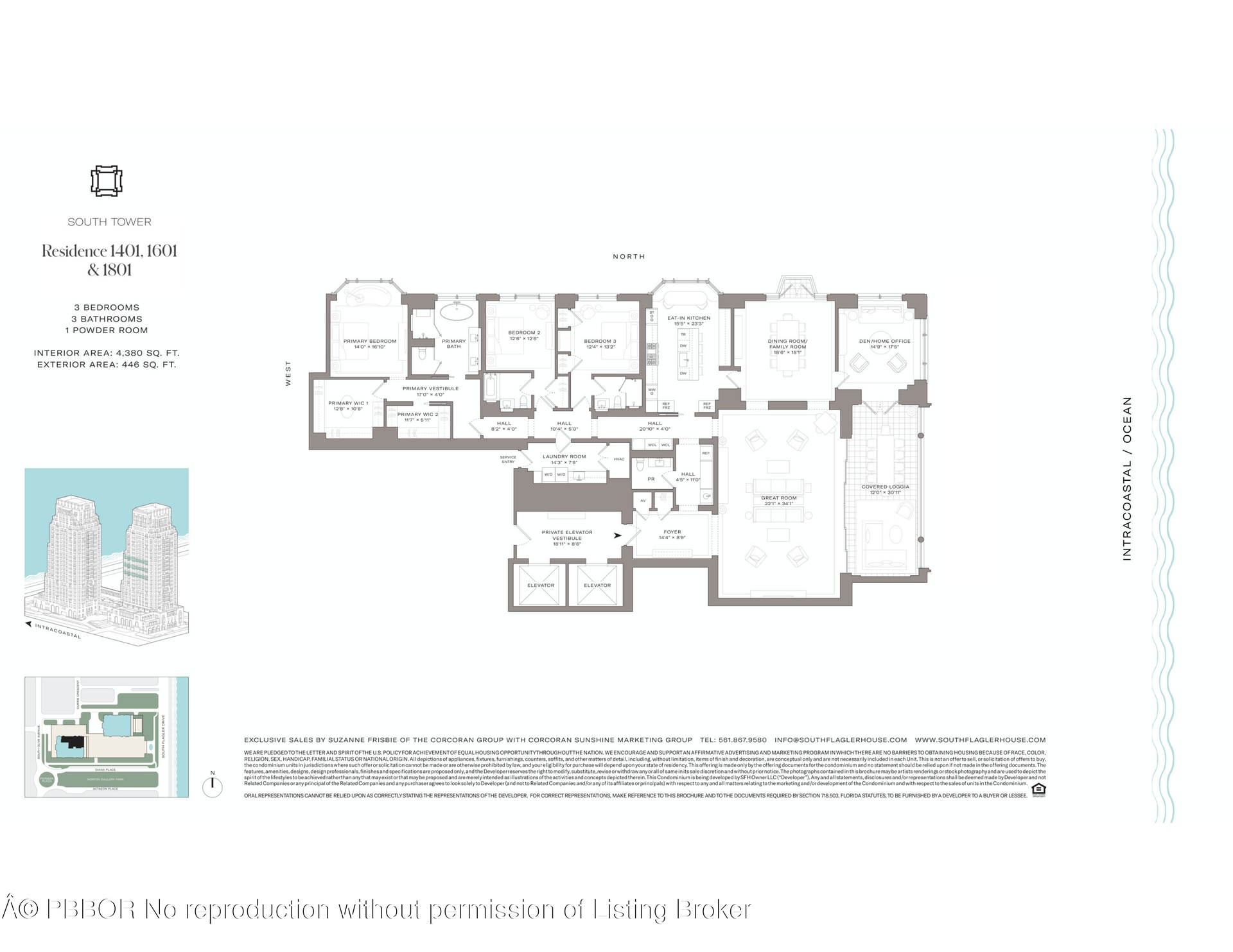 South Tower Residence 1801 at South Flagler House is a 3 BR, 3.1 BA home in the sky designed for unparalleled waterfront living. A private elevator vestibule opens to a gracious foyer leading to a sunlit great room and expansive loggia with sweeping views of the Intracoastal, Palm Beach Island, and the Atlantic Ocean. The formal dining room and corner den/office create refined spaces for entertaining and quiet retreat. The primary suite has dual walk-in closets. Additional highlights include an eat-in kitchen, laundry room that doubles as a service entry, and secondary bedrooms with en-suite baths, blending comfort and sophistication. South Flagler House, presented by Related Ross, combines the timeless style of Robert A.M. Stern Architects & the luxurious aesthetic of Pembrooke & Ives, resulting in soulful spaces designed for an enhanced lifestyle. Primely positioned on 3.4 acres along the Intracoastal Waterway at 1355 S Flagler Dr. South Flagler House features two 28-story structures with 105 beautifully appointed 2-to-5-bedroom homes. Representing the single largest amenity offering per residence in all of Palm Beach County. Residents will have access to lifestyle amenities of unprecedented range & quality, with on-site concierge services surpassing those of the most exclusive private members' clubs.