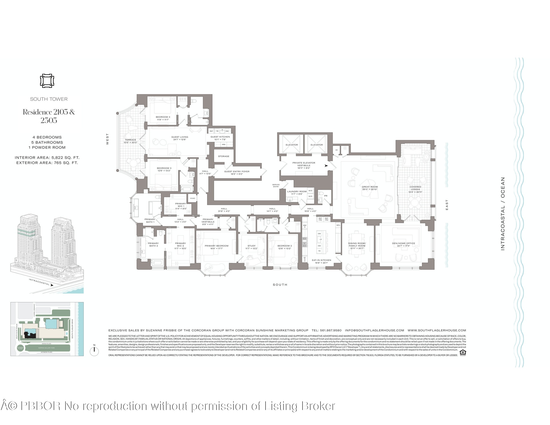 South Tower Residence 2103 at South Flagler House captures the essence of waterfront living with 4 BR and 5.1 BA designed for elegance and ease. A private elevator opens to a sunlit great room with sweeping views of the Intracoastal, Palm Beach Island, and the Atlantic Ocean. The primary suite is a serene retreat with dual baths & dual walk-in closets. Thoughtfully designed for both comfort and entertaining, the residence features an eat-in kitchen, library/office, guest wing with its own private terrace, and expansive outdoor living that seamlessly blends with the interiors. South Flagler House, presented by Related Ross, combines the timeless style of Robert A.M. Stern Architects & the luxurious aesthetic of Pembrooke & Ives, resulting in soulful spaces designed for an enhanced lifestyle. Primely positioned on 3.4 acres along the Intracoastal Waterway at 1355 S Flagler Dr. South Flagler House features two 28-story structures with 105 beautifully appointed 2-to-5-bedroom homes. Representing the single largest amenity offering per residence in all of Palm Beach County. Residents will have access to lifestyle amenities of unprecedented range & quality, with on-site concierge services surpassing those of the most exclusive private members' clubs.
