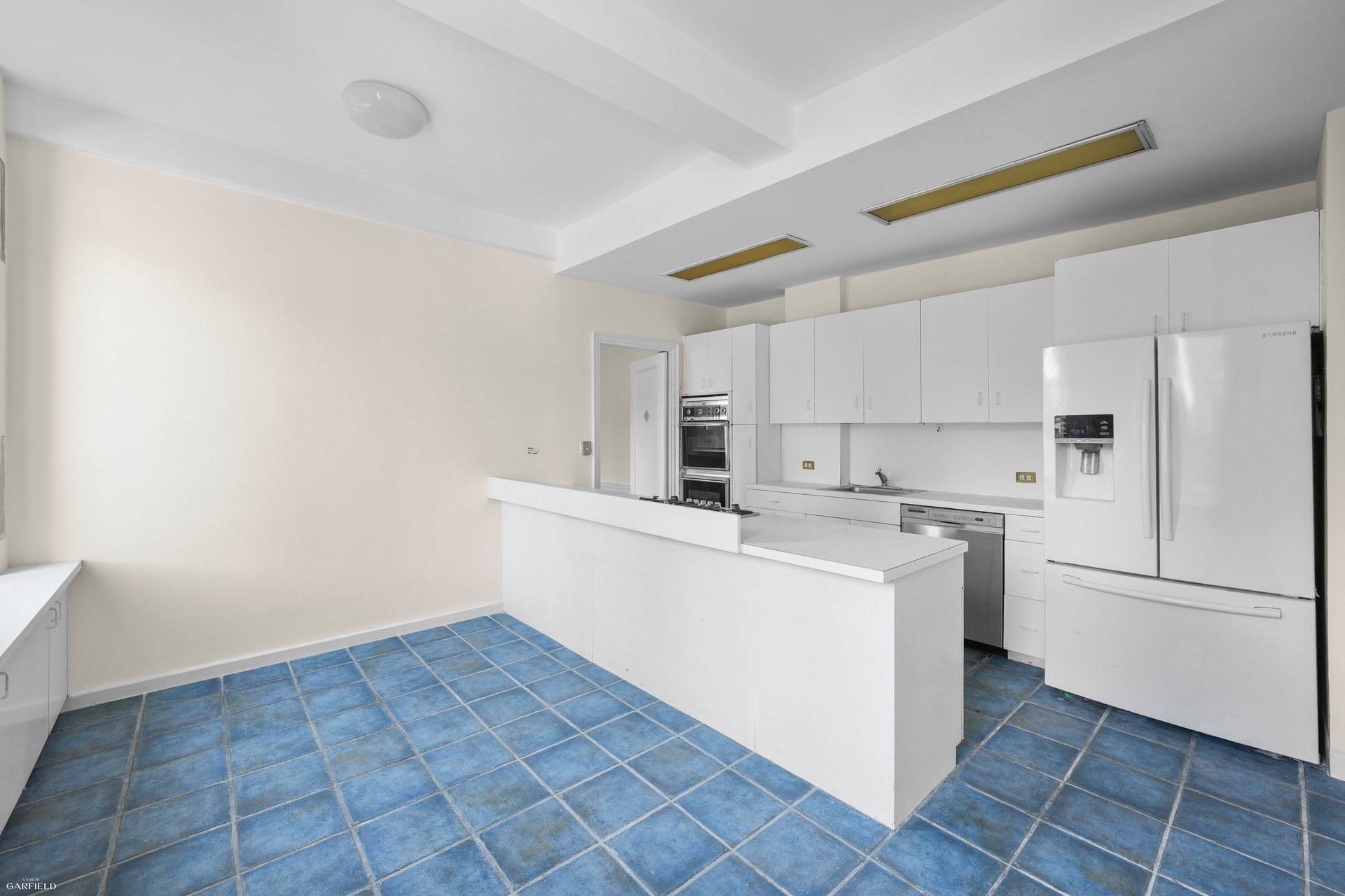 A formal dining room overlooks treetops and townhouses to the east, while the spacious, windowed eat-in kitchen offers exceptional light and functionality. A flexible office with powder room and service entrance adds versatility for use as a study or staff space.