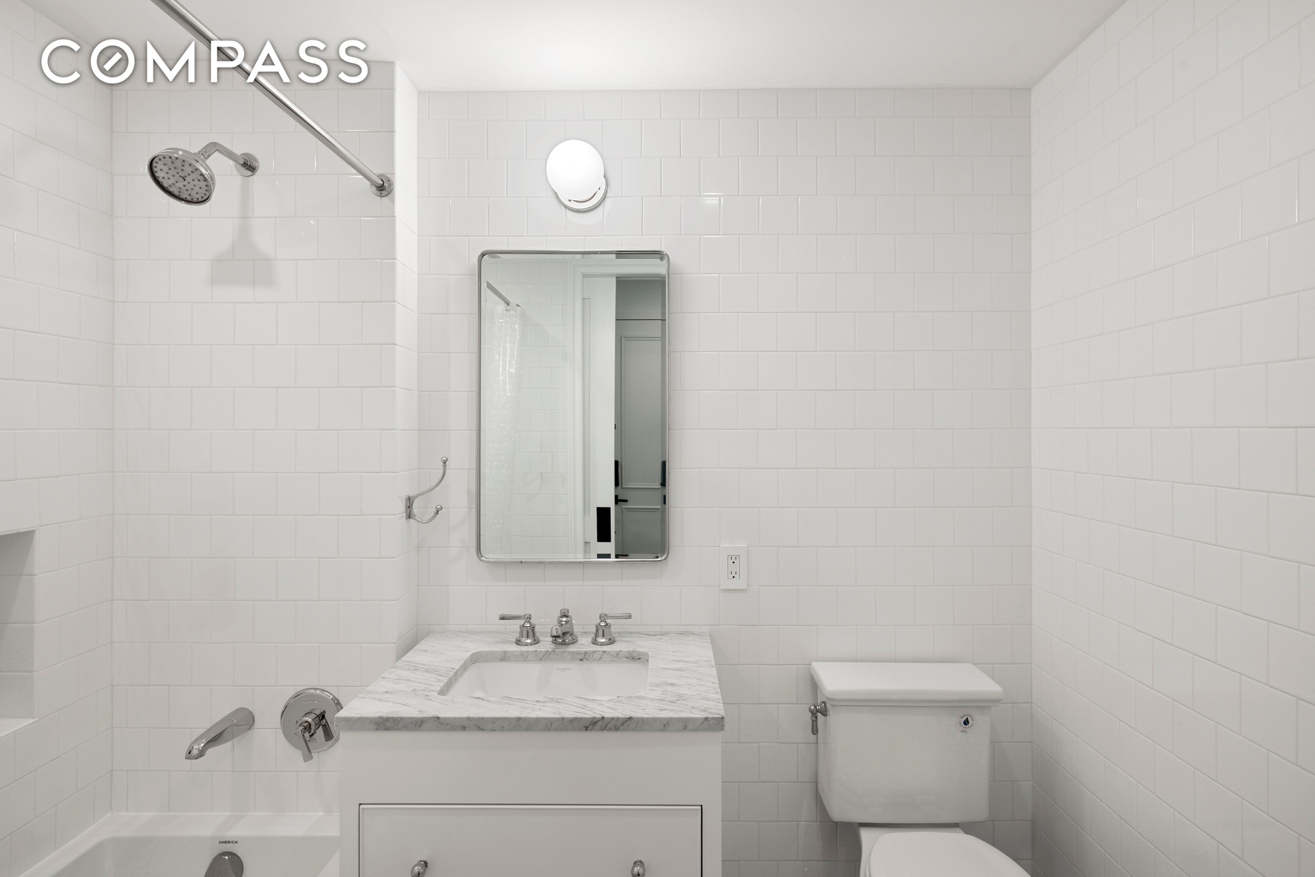 The serene primary suite includes a walk-in closet and spa-inspired bath with marble finishes, a custom double vanity, and Waterworks fixtures. A spacious second bedroom and full guest bath provide flexibility for family, guests, or a home office. With generous closet space and an in-unit Bosch washer/dryer, the home blends convenience with design.