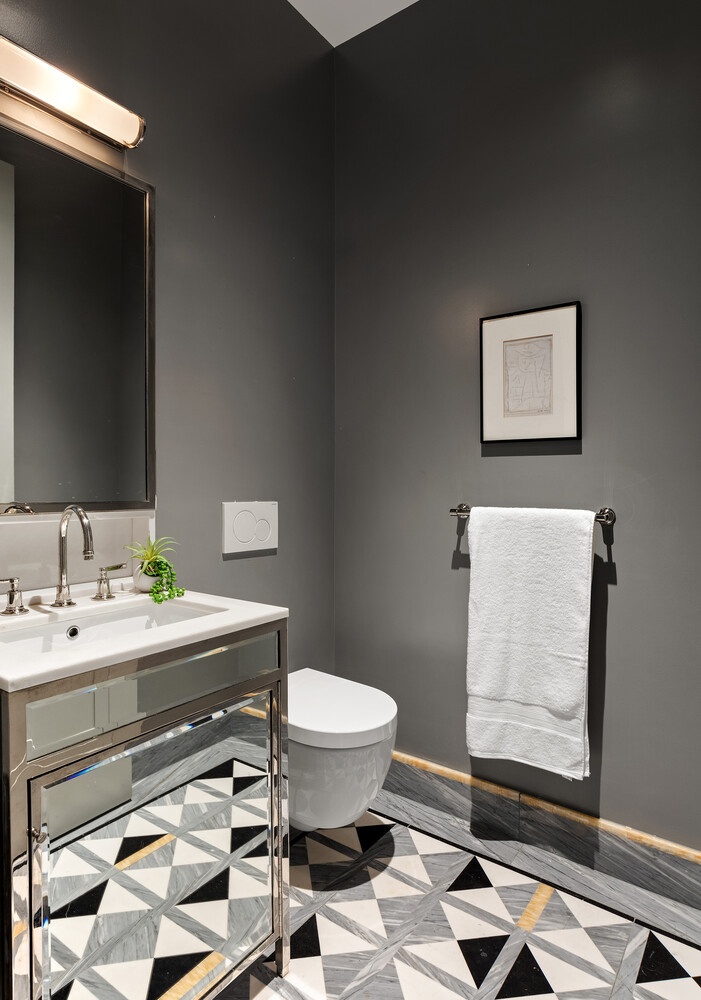 The primary suite enjoys iconic views of the Statue of Liberty and Manhattan skyline, along with a spa-like five-fixture bath clad in marble. Radiant heated floors, a custom oak vanity, a marble-framed tub, and a windowed shower create an atmosphere of understated luxury. Each secondary bedroom includes its own en-suite bath, while the powder room is finished with marble mosaic floors and a Waterworks vanity.