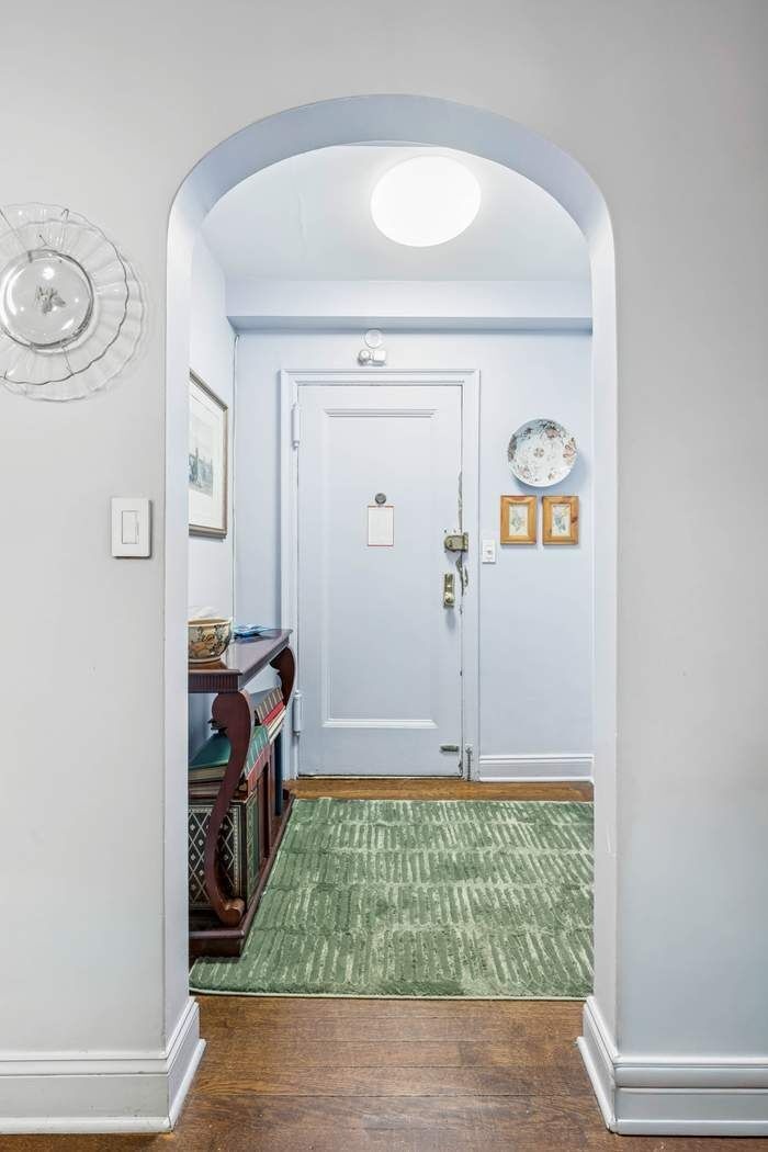 Enter through the arched foyer that leads into a calm and comfortable living room featuring original beamed ceilings, hardwood floors, and classic pre-war proportions. The living room easily accommodates a full seating area and has a separate dining alcove that can also be purposed as a home office. Adjacent to the living room is a windowed kitchen with a functional layout for everyday use.
