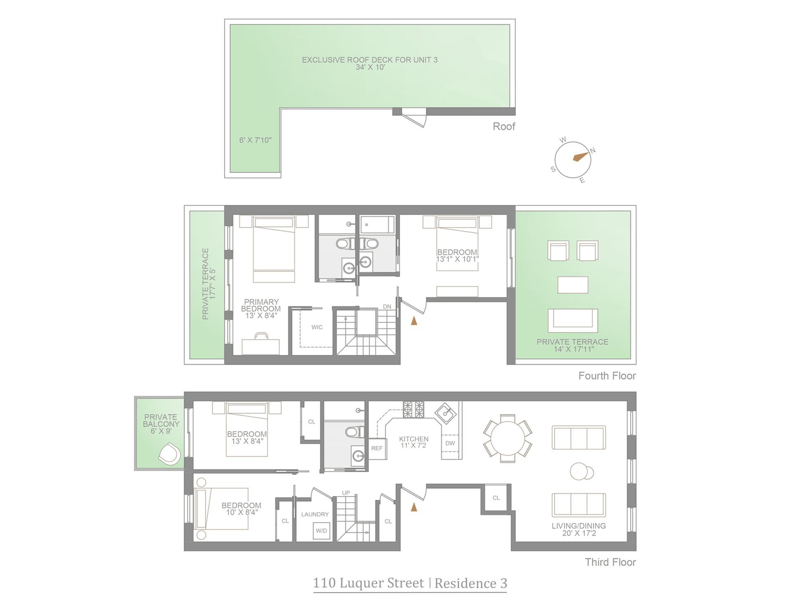 Introducing 110 Luquer Street, nestled in the vibrant heart of Carroll Gardens! Unit Three is a sun-drenched duplex featuring 4 bedrooms, 3 baths, and 4 private greenspaces. This newly renovated home spans the two floors and the private roof deck of a charming Carroll Gardens townhouse, with the building's finely crafted black wrought iron detailing celebrating the renowned craftsmanship and historic elegance of the area.
