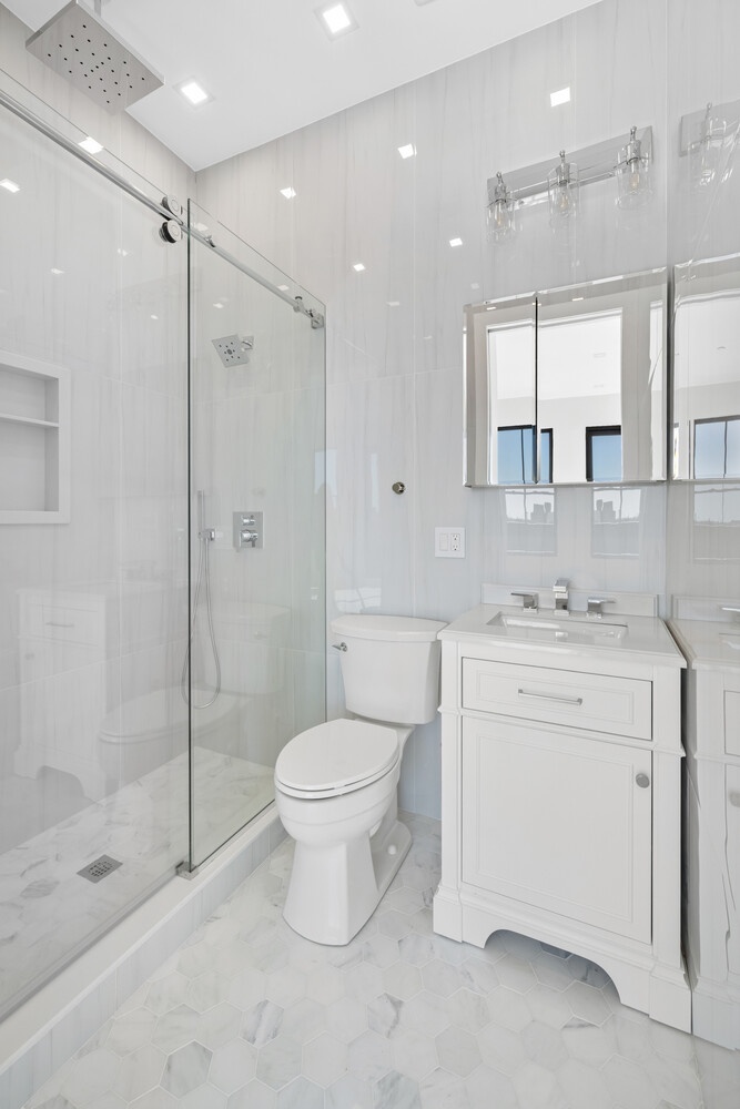 Each bathroom is elegantly appointed with custom finishes and marble tile work. Luxurious details include oversized vanities offering ample storage, a sumptuous soaking tub, and a large walk-in rain shower.