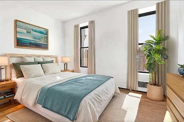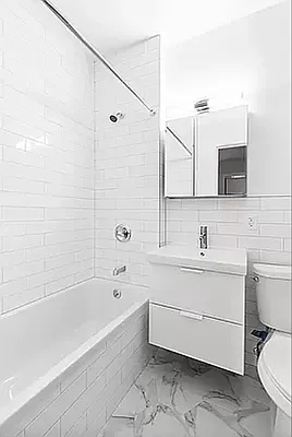 Apartment 5F at 109 Montague Street is a south-facing 2-bedroom, 2-bathroom home that has undergone a complete renovation and modernization. The open living and dining area features an L-shaped kitchen equipped with full sized stainless steel appliances, white shaker cabinetry, and white Caesarstone countertops. This flexible space features two south-facing windows and a historic decorative fireplace as focal points, and can be arranged to include a dining area and living area.