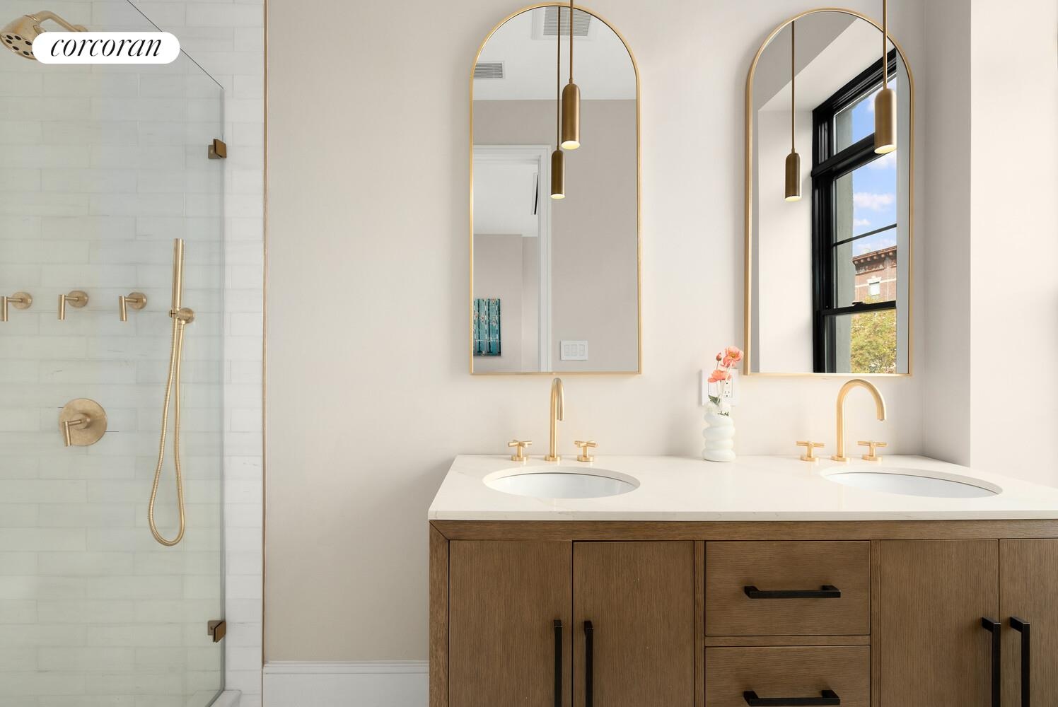 Upstairs, the primary suite offers a peaceful retreat with large windows, abundant closet space, and a spa-like windowed marble bath with double vanity and step-in shower, while two additional bedrooms, another marble bathroom, plus laundry and linen closets complete the floor.