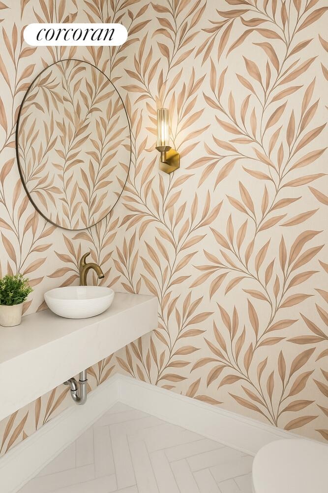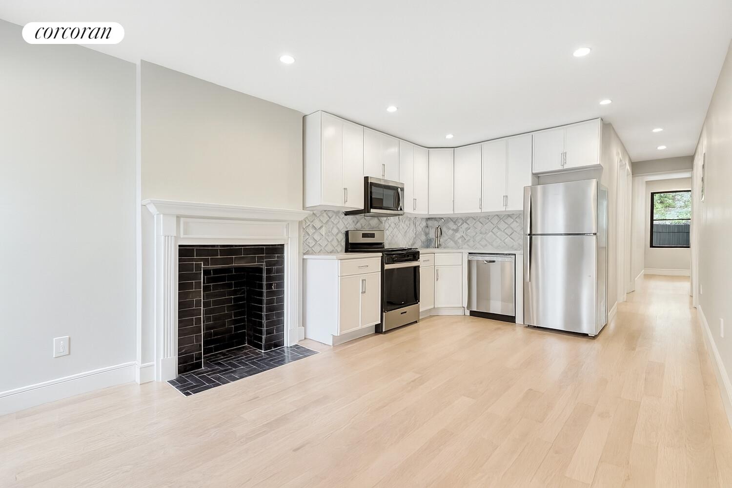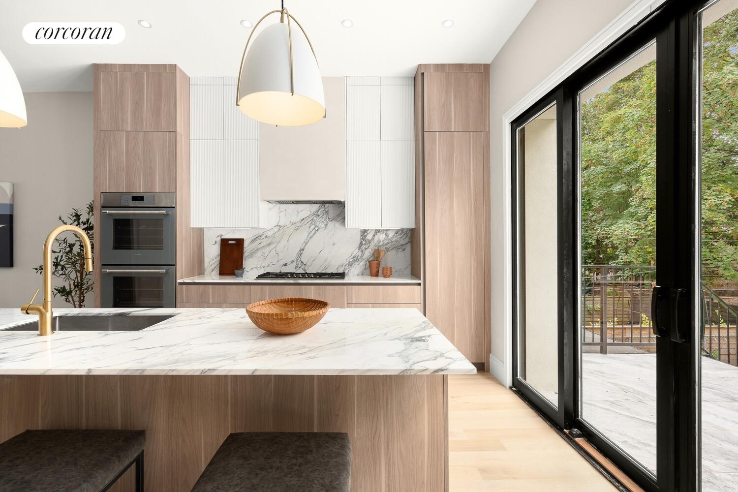 The 45-foot parlor floor stretches from a gracious living and dining area with a decorative fireplace straight into a kitchen that anchors the entire home. Wrapped in custom ashy walnut cabinetry and elegant Calacatta marble, the kitchen is as functional as it is beautiful, with Thermador double wall ovens, an integrated dishwasher, and full-height separate Fisher & Paykel refrigerator and freezer framing a perfect wet bar. A discreet pantry adds storage and utility, while oversized sliding glass doors extend the space onto a South-facing deck overlooking the backyard. Even the powder room makes a statement with bold wallpaper.