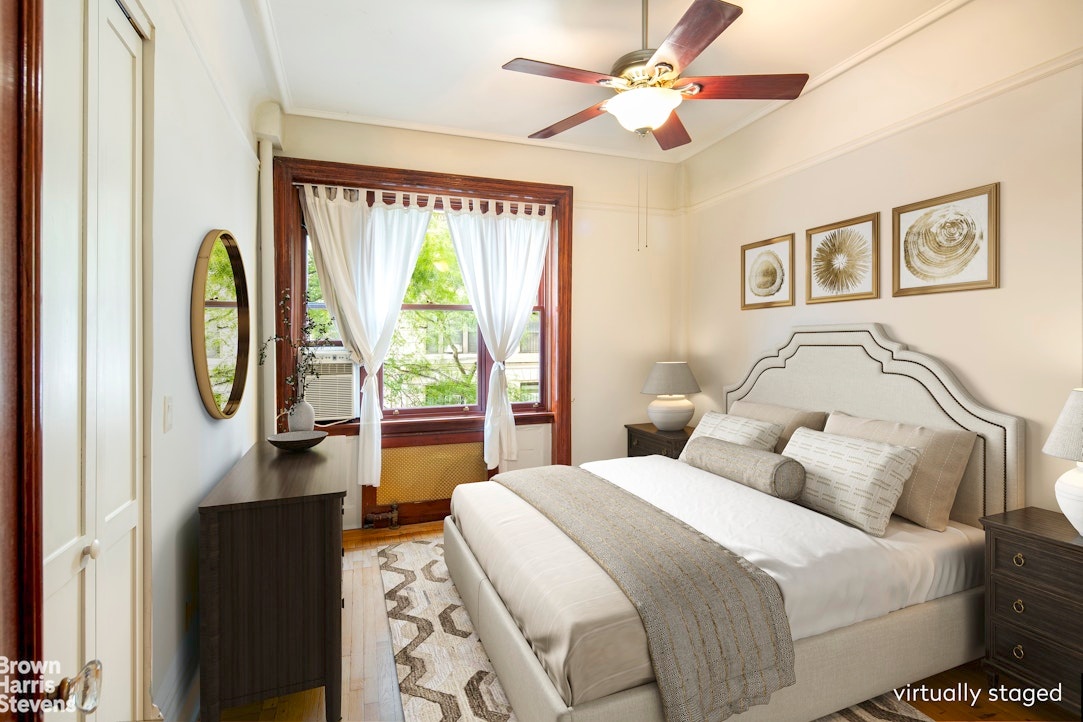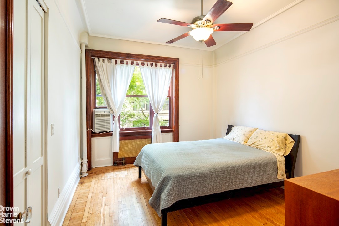 Located on the 2nd floor, this thoughtfully designed apartment combines classic pre-war elegance with modern convenience. Soaring 10-foot ceilings and refurbished hardwood floors with original mahogany inlay create a warm, inviting ambiance, while oversized, whisper-quiet windows frame picturesque, tree-lined views of 114th Street. The open kitchen is a chef's dream, featuring a sleek Smeg oven and range, custom cabinetry, a wood-paneled Miele dishwasher, and a moveable island for flexible entertaining. A Liebherr refrigerator adds a touch of luxury, and the ceiling fan in the living room ensures refreshing air circulation year-round. Generous closets offer ample storage, and W/Ds are permitted with board approval. Best of all, the owner has already covered the assessment for ongoing capital improvements, making this home a turnkey opportunity in a friendly, well-maintained building.