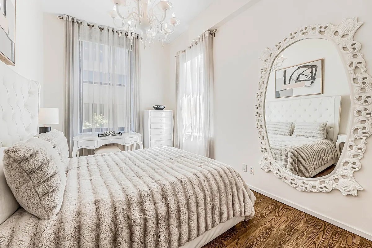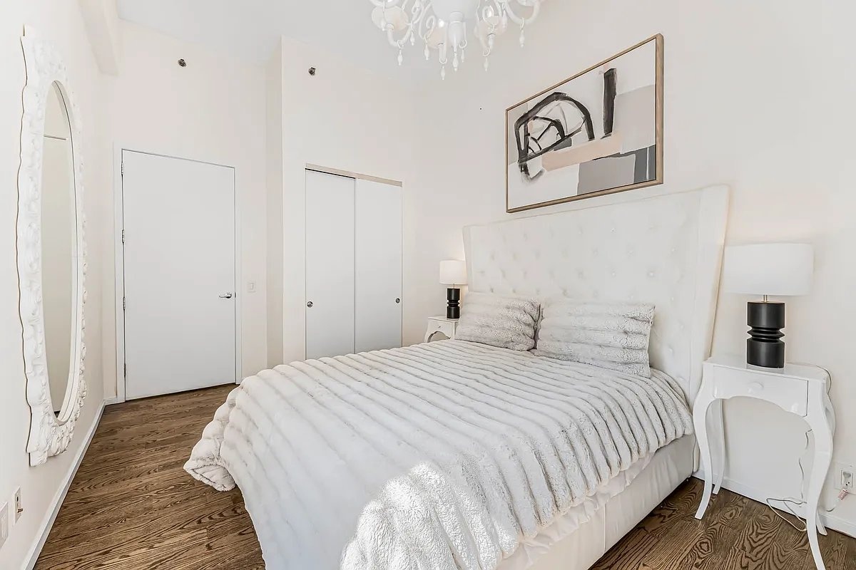 The corner bedroom, with exposures north and west, is highlighted by a stunning custom Murano chandelier and offers space for a dedicated home office. Ample closet storage and recently updated HVAC systems (within the last 3 years) add comfort and functionality. The Carrara marble bath features a deep soaking tub, large vanity, and new mirrors.