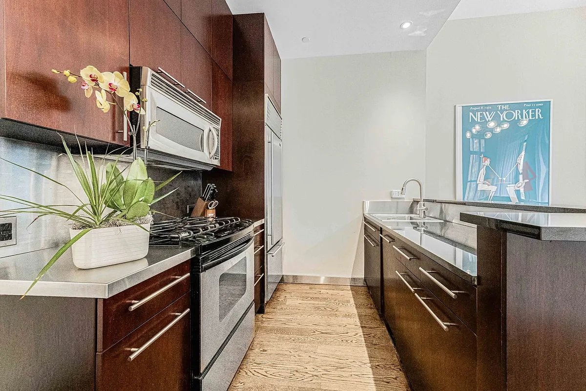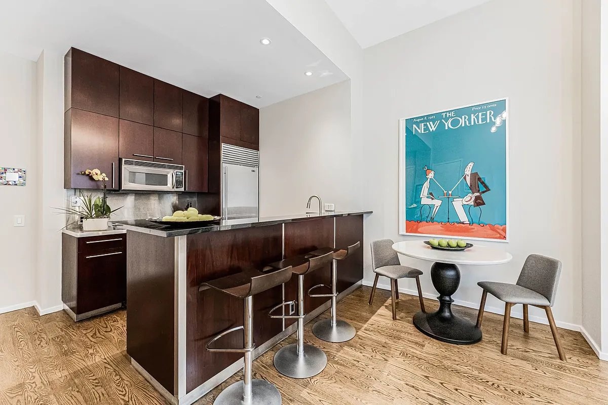 The chefs kitchen is outfitted with floor-to-ceiling walnut cabinetry, granite countertops, a breakfast bar, and top-tier appliances: a Microwave, a Sub-Zero refrigerator, KitchenAid range, and Miele dishwasher.