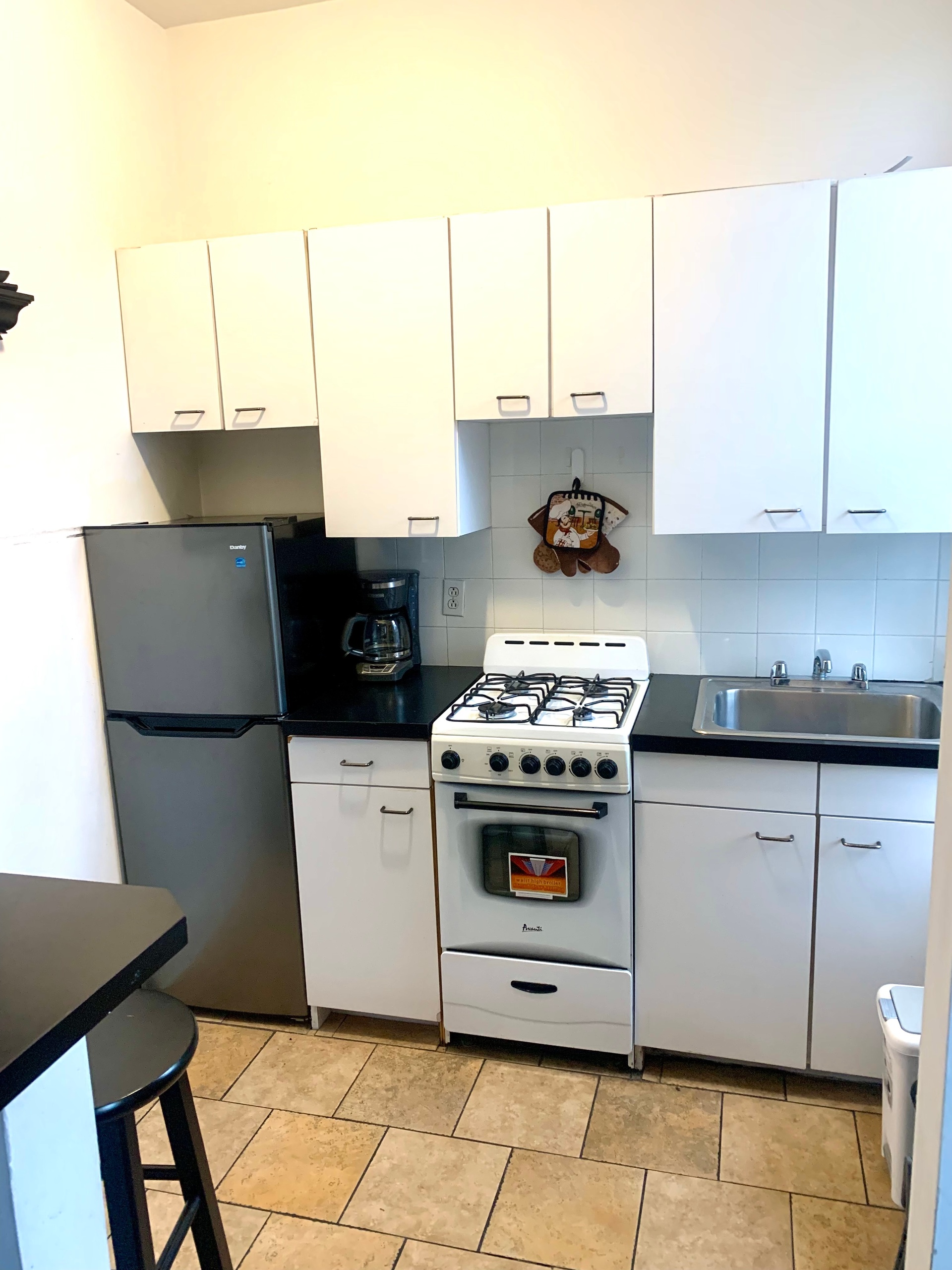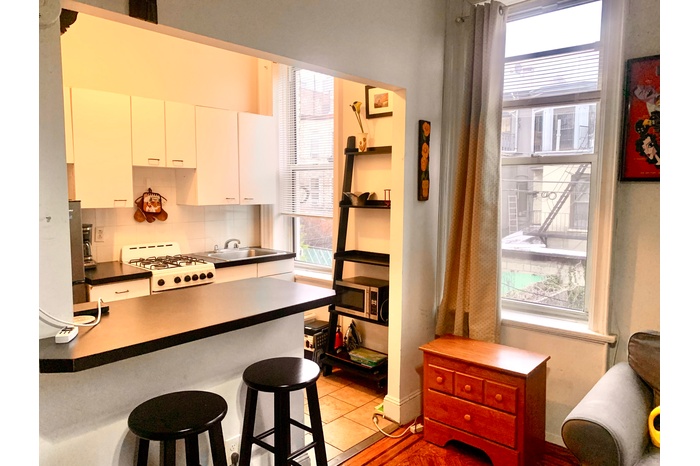 The apartment features hardwood floors, an updated kitchen and lots of light. This apartment comes equipped with a full size Murphy bed.
