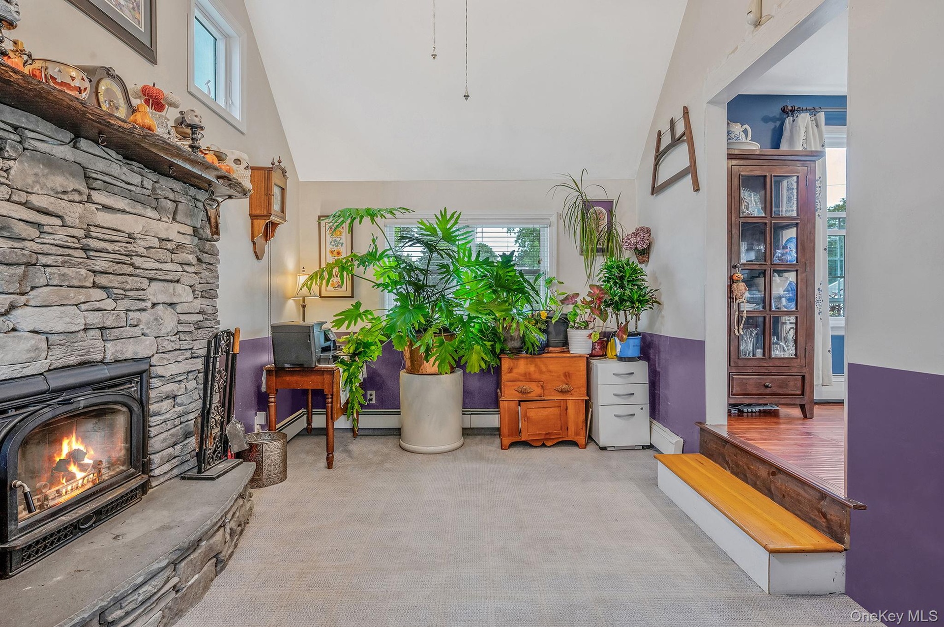 - Living area featuring high vaulted ceiling, carpet, plenty of natural light, a stone fireplace, and a baseboard radiator
