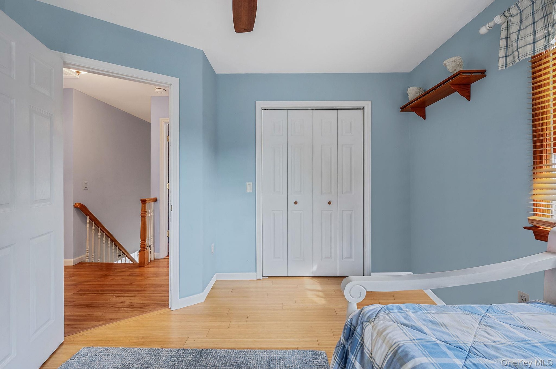 - Bedroom with light wood-style floors, a closet, and a ceiling fan