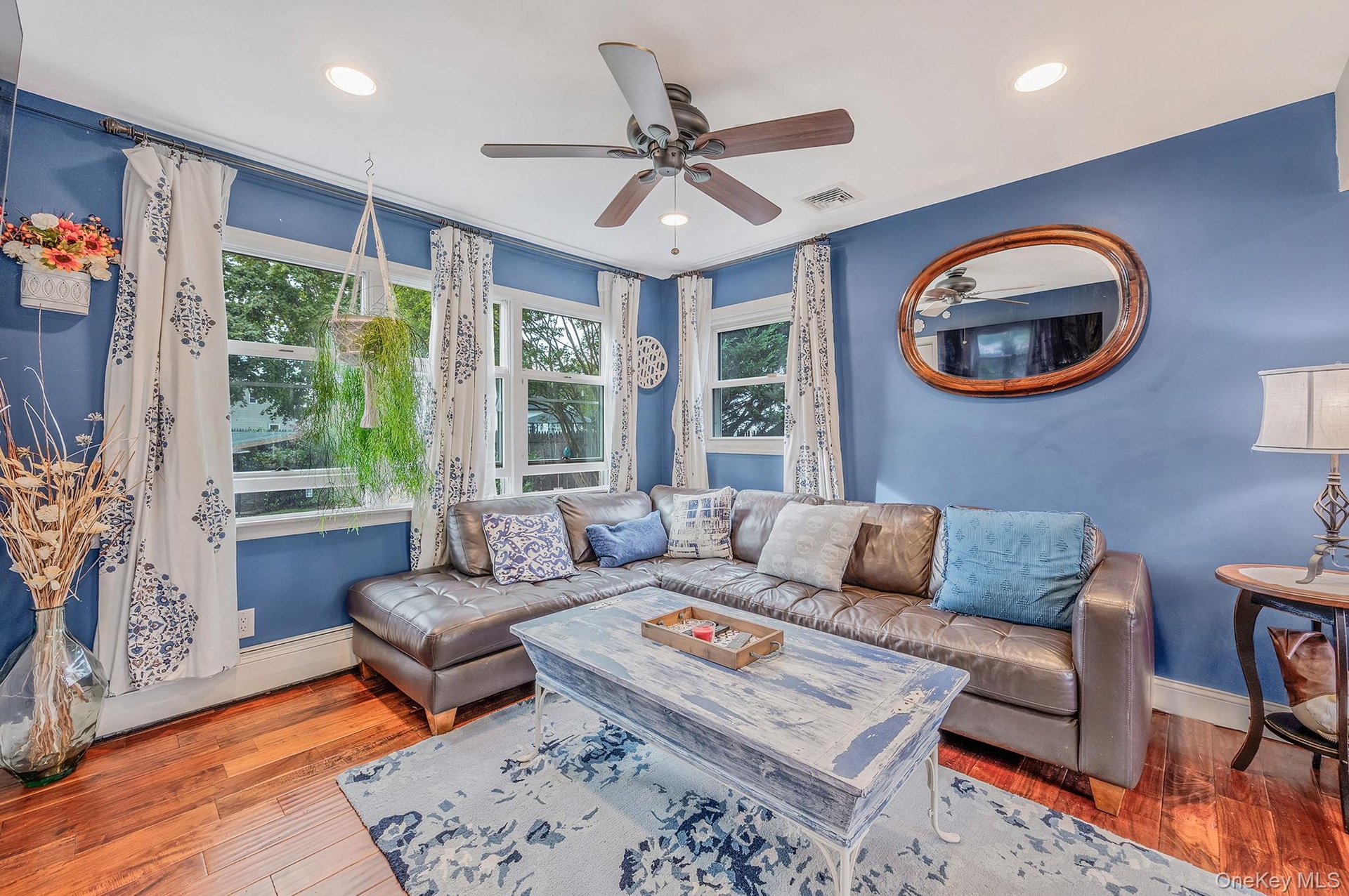 - Living room with wood finished floors, a ceiling fan, and recessed lighting
