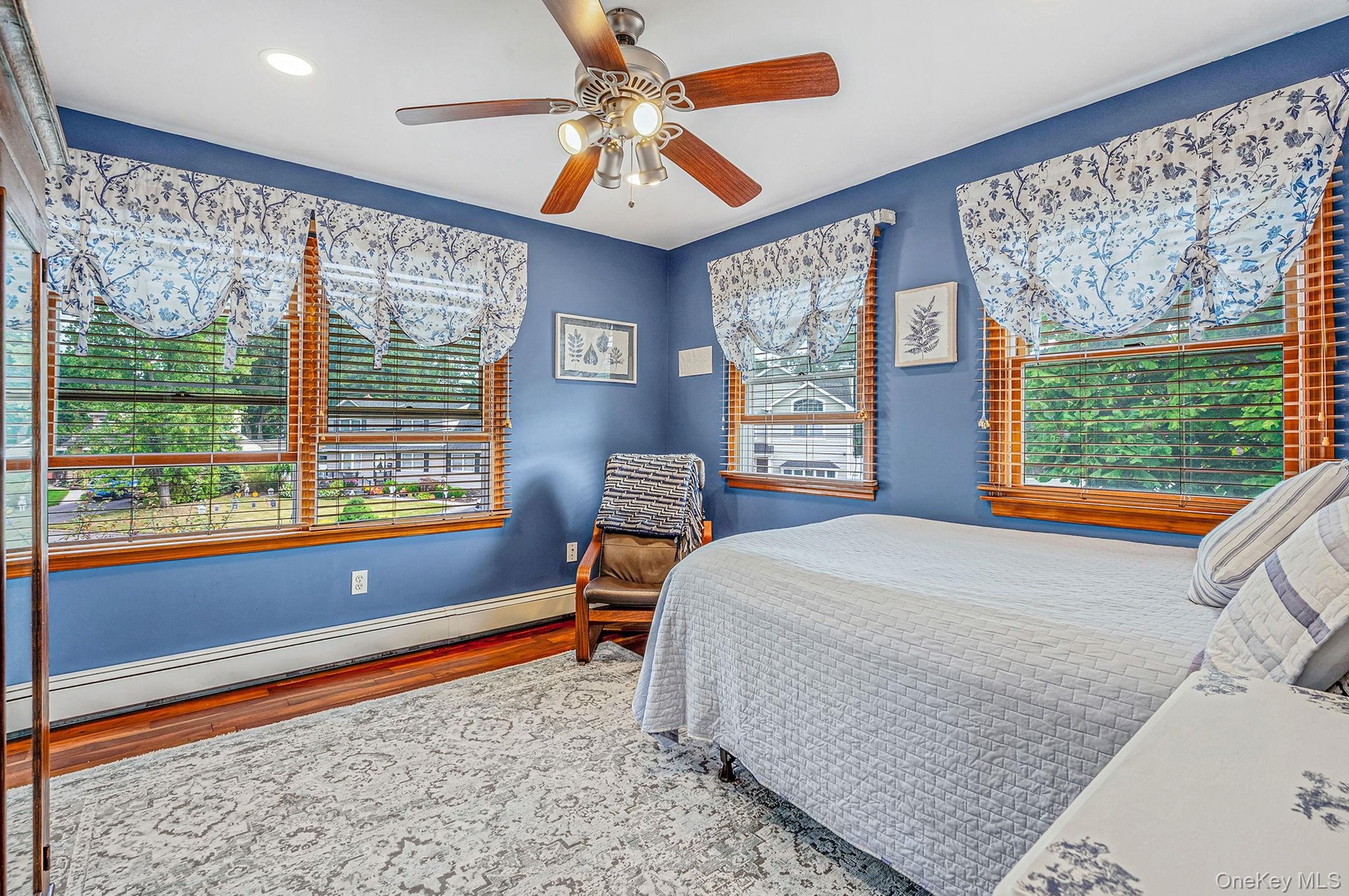 - Bedroom featuring wood finished floors, baseboard heating, multiple windows, a ceiling fan, and recessed lighting