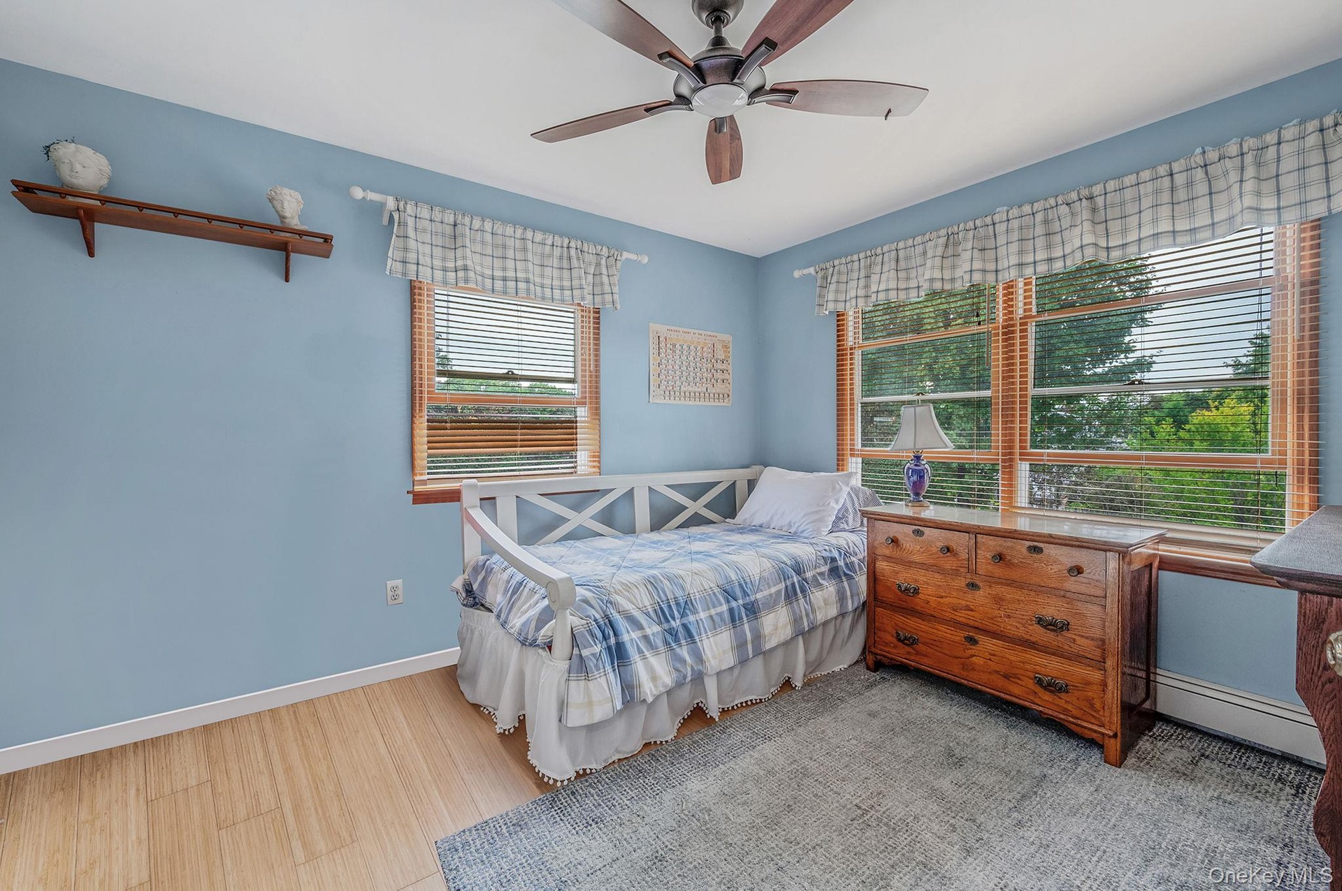 - Bedroom with wood finished floors, baseboard heating, and a ceiling fan