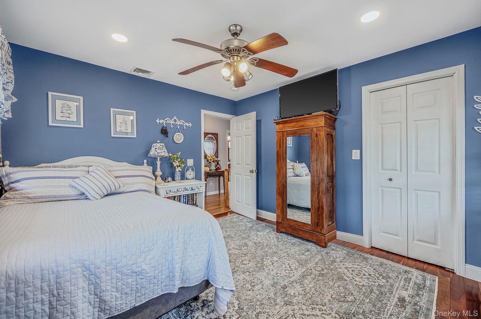 - Bedroom with wood finished floors, a closet, ceiling fan, and recessed lighting