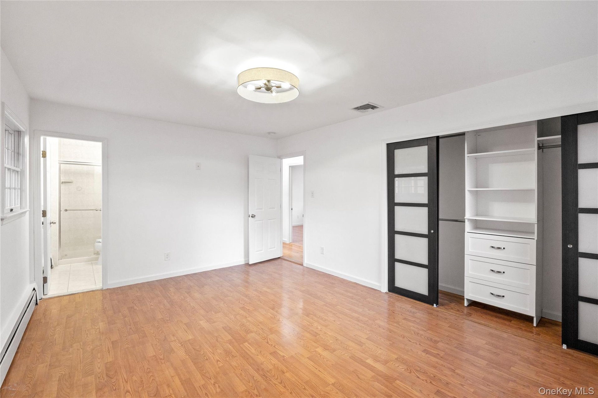 - Unfurnished bedroom with baseboard heating, light wood-type flooring, a closet, and ensuite bath