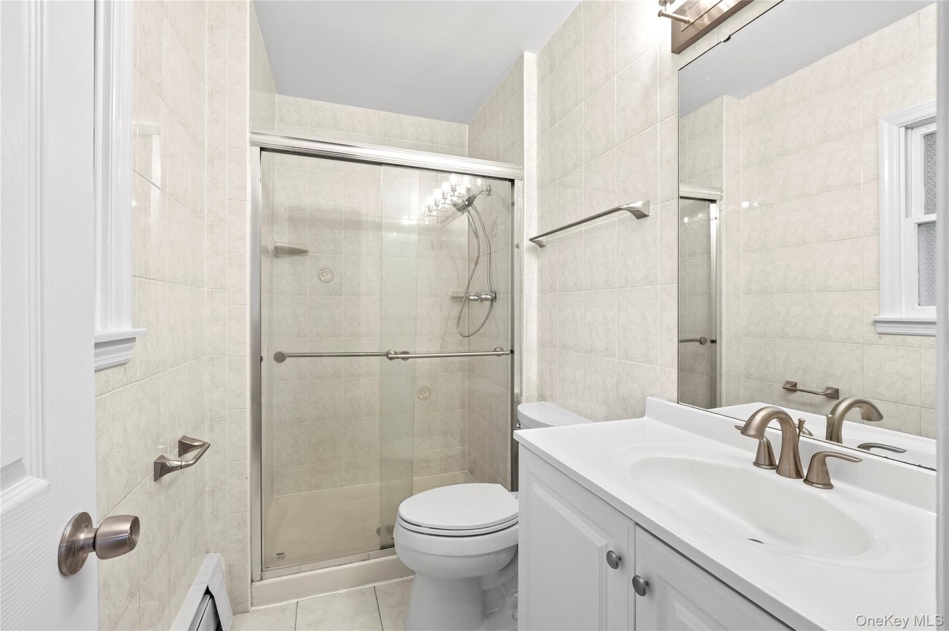 - Bathroom with tile walls, vanity, a shower stall, baseboard heating, and light tile patterned floors