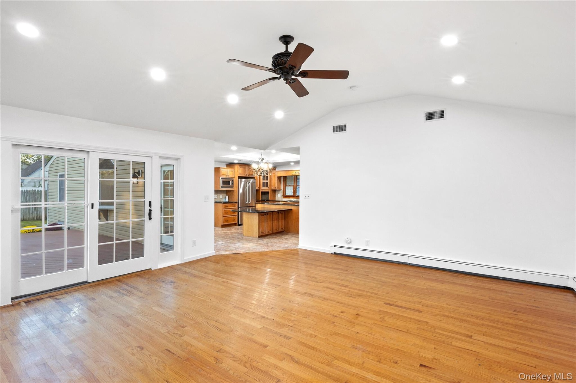 - Unfurnished living room with lofted ceiling, light wood-style flooring, recessed lighting, a baseboard radiator, and a ceiling fan