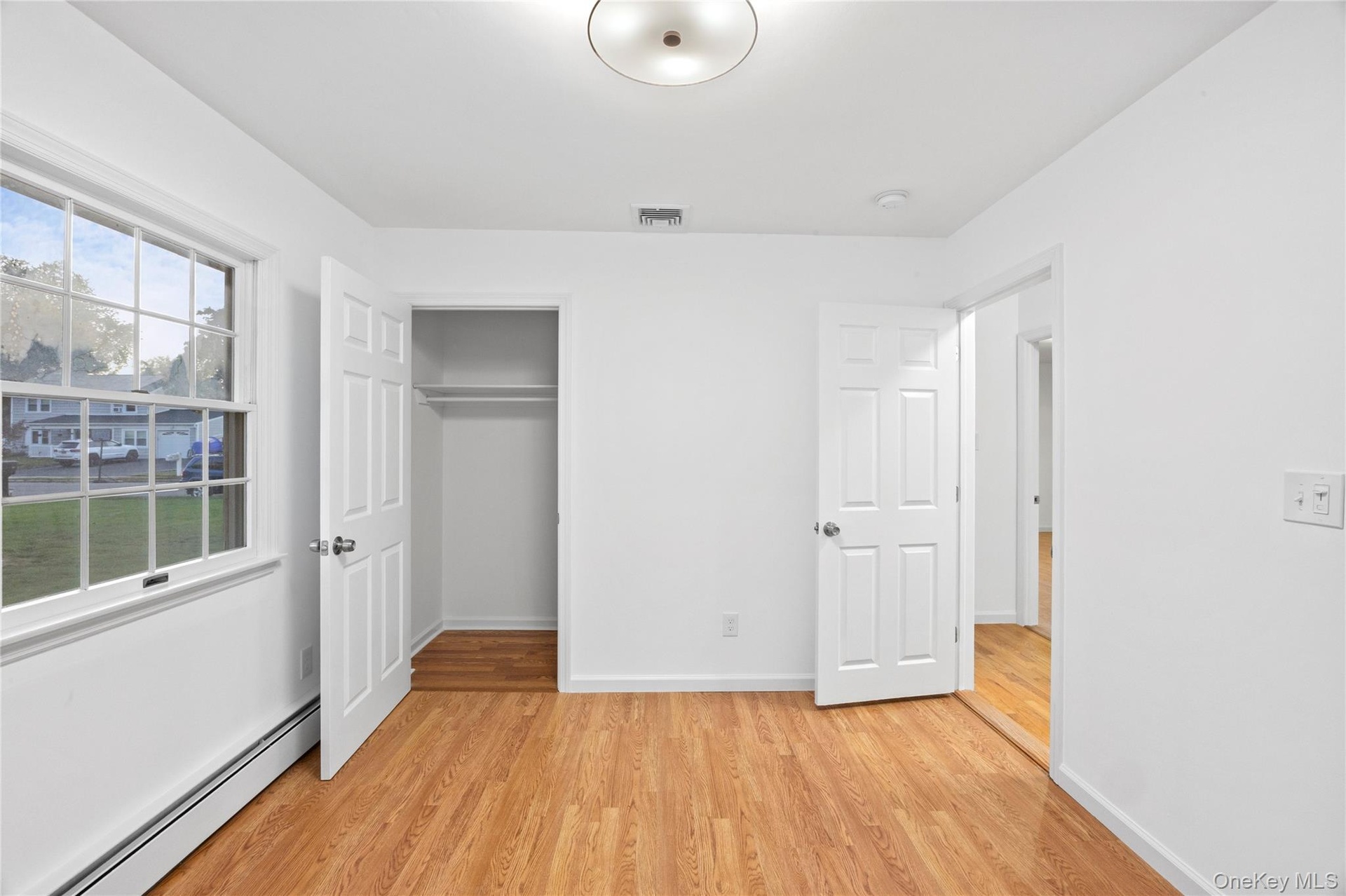 - Unfurnished bedroom with a baseboard radiator, light wood finished floors, and a closet
