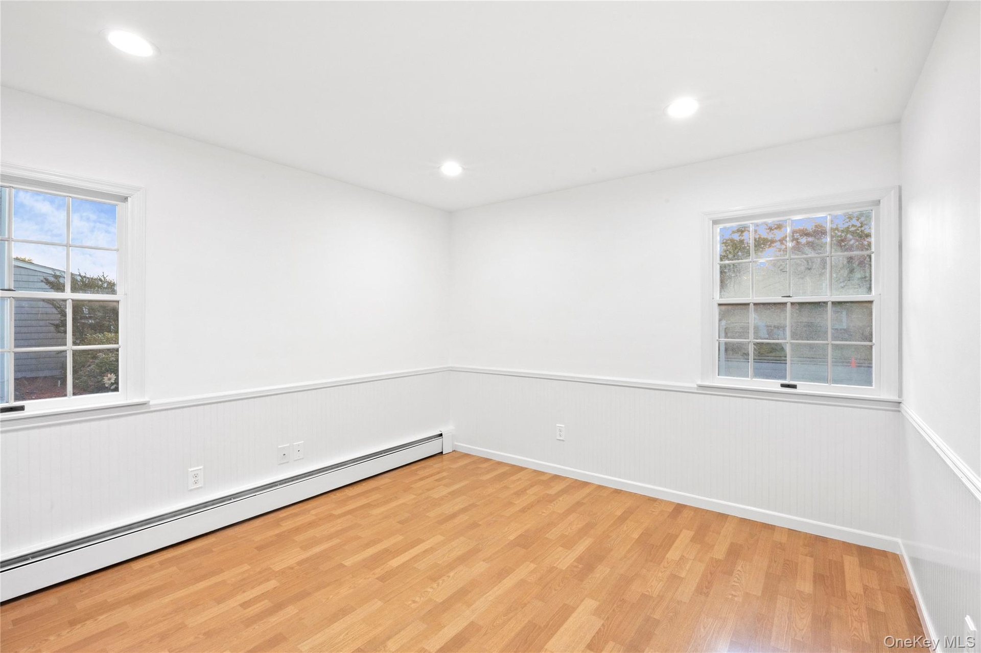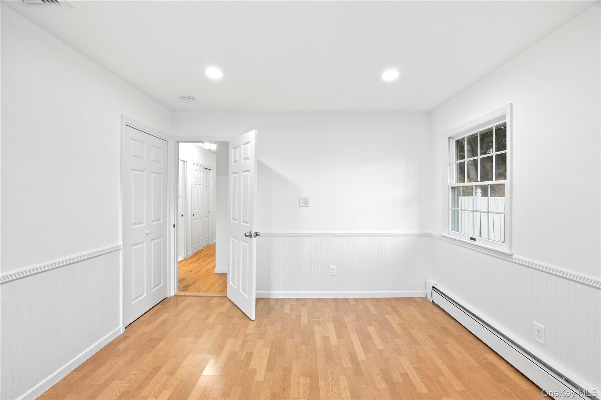 - Spare room with a baseboard radiator, light wood-style flooring, recessed lighting, and wainscoting