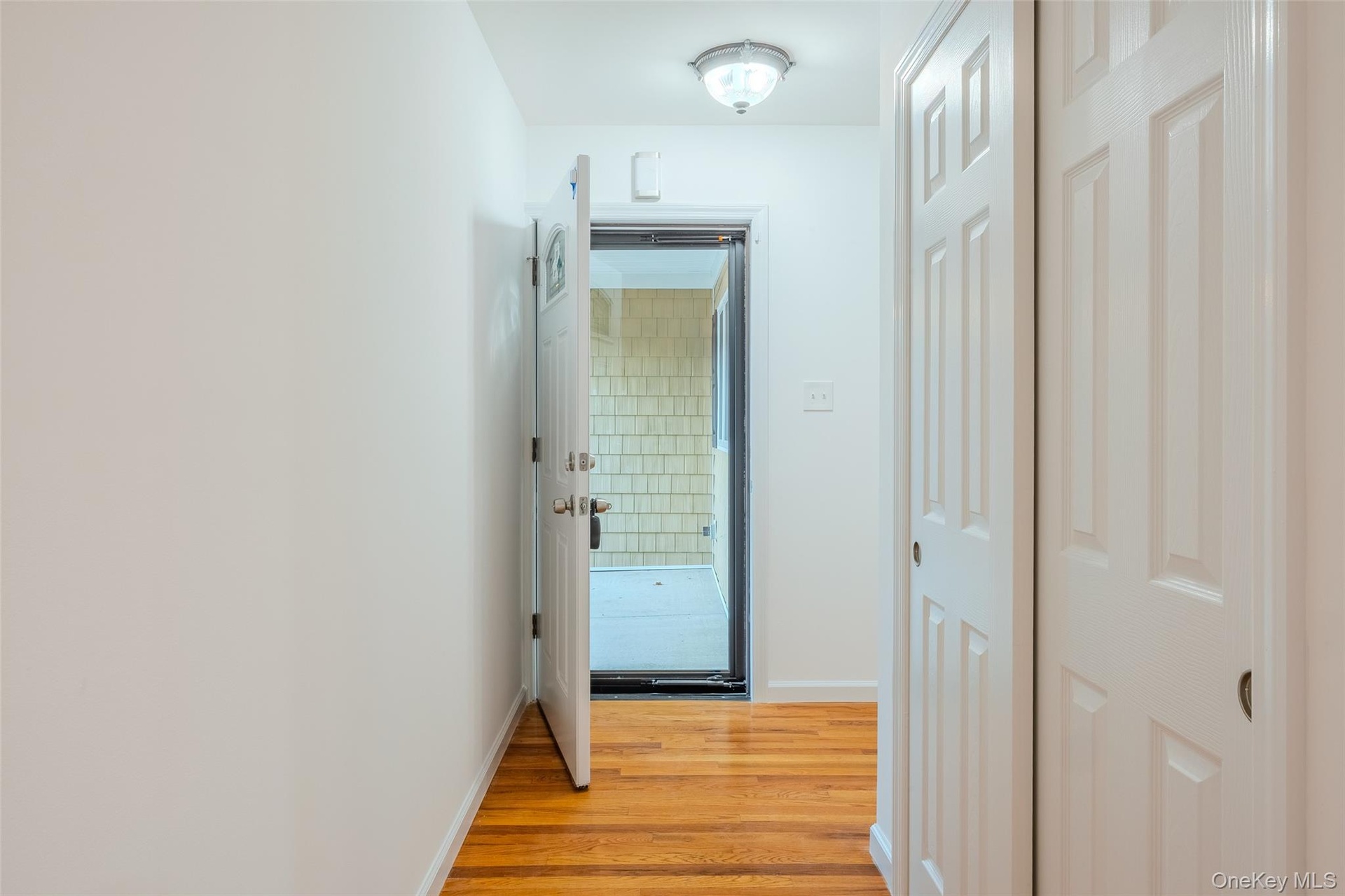 - Hall featuring light wood-style flooring and baseboards