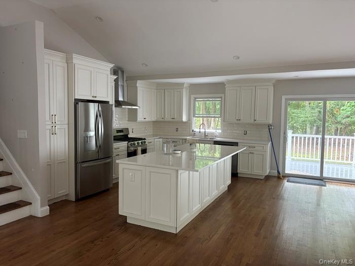 - Kitchen featuring stainless steel appliances, decorative backsplash, wall chimney exhaust hood, white cabinetry, and a center island