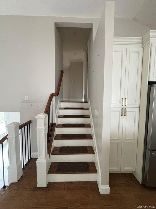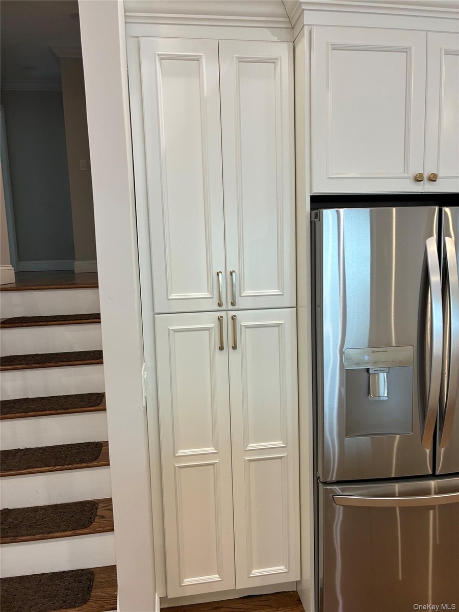 - Kitchen featuring stainless steel fridge with ice dispenser and white cabinetry