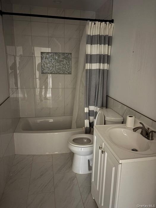 - Bathroom featuring shower / tub combo with curtain, vanity, and marble look tiles
