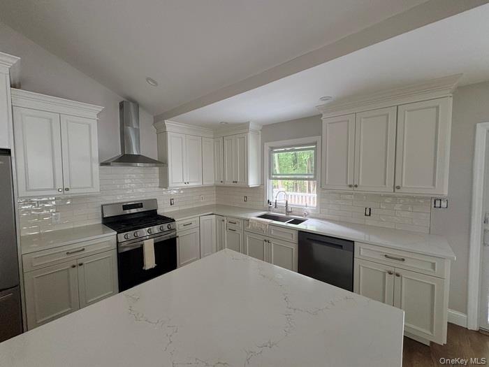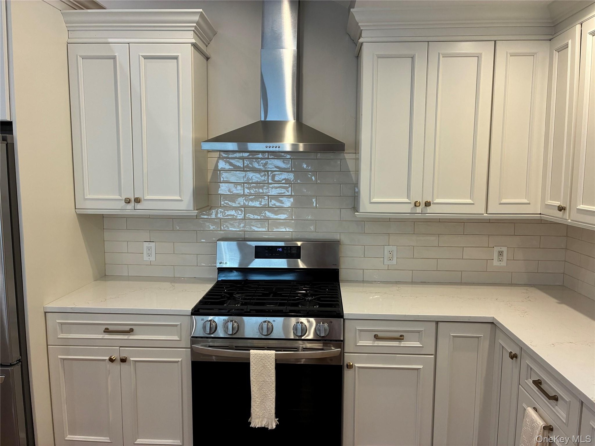 - Kitchen with stainless steel appliances, wall chimney range hood, light stone countertops, and decorative backsplash