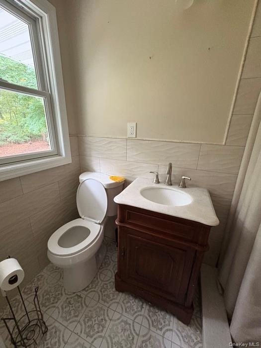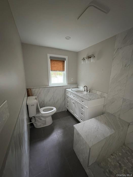 - Bathroom featuring tile walls, a wainscoted wall, vanity, and dark tile patterned floors