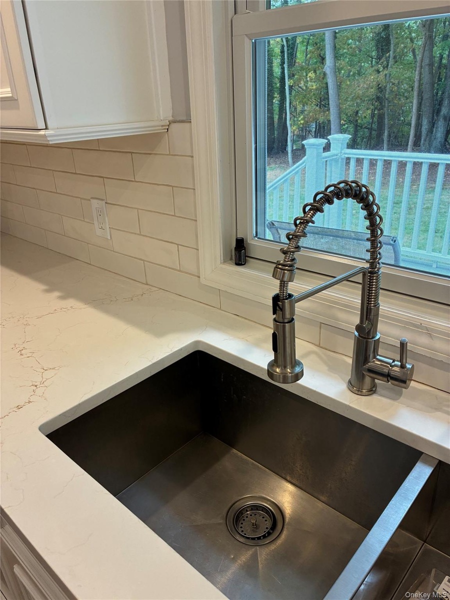 - Kitchen view of light stone countertops, tasteful backsplash, and white cabinetry