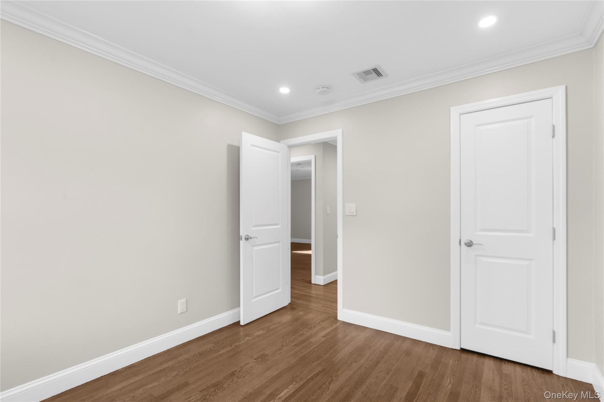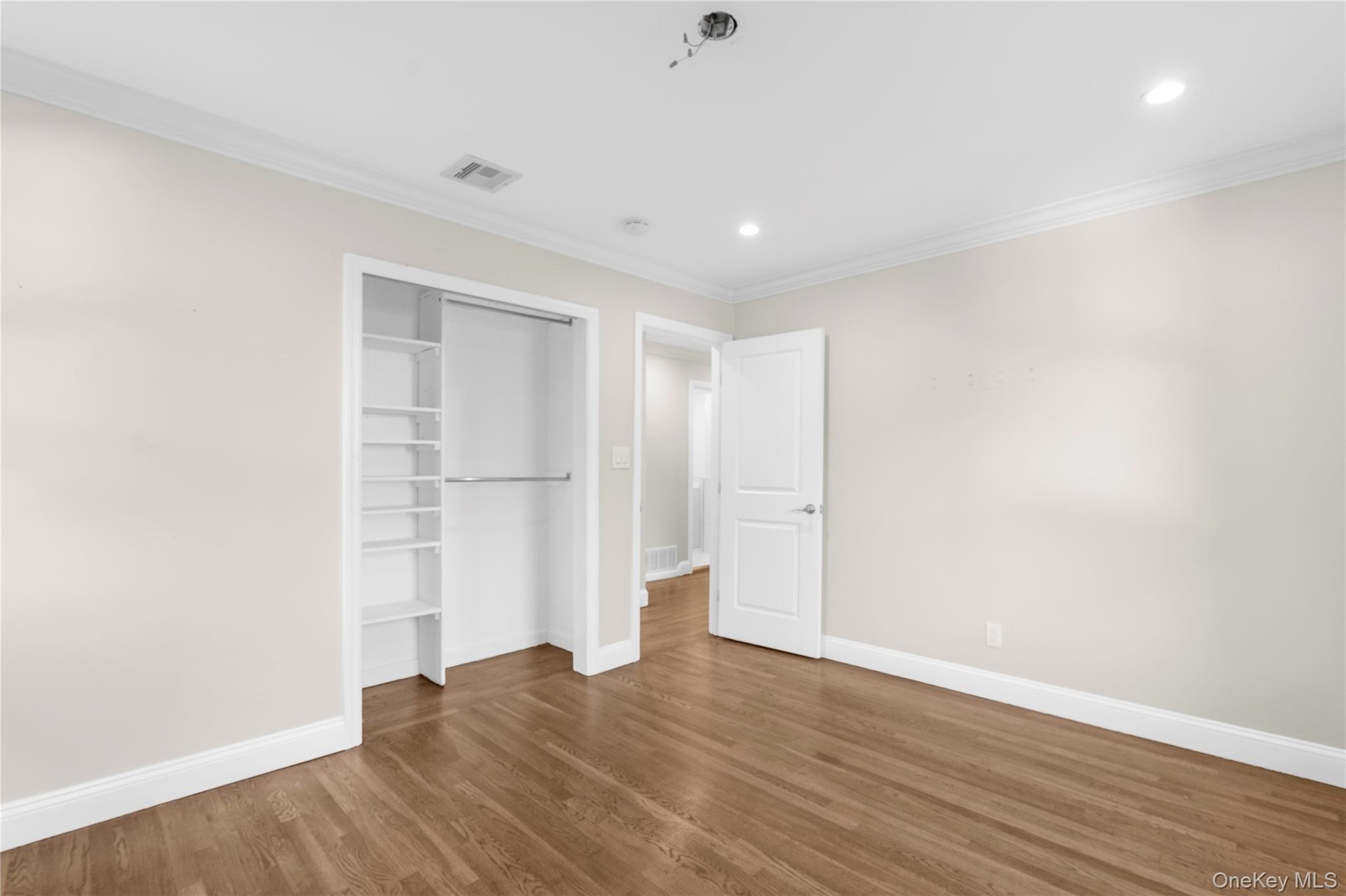 - Unfurnished bedroom with ornamental molding, wood finished floors, recessed lighting, and a closet