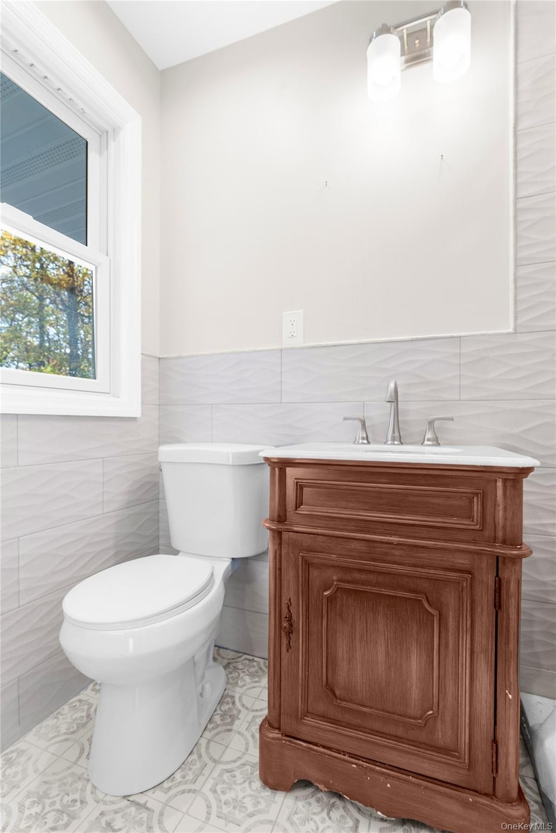 - Bathroom featuring tile walls, vanity, light tile patterned floors, and a wainscoted wall