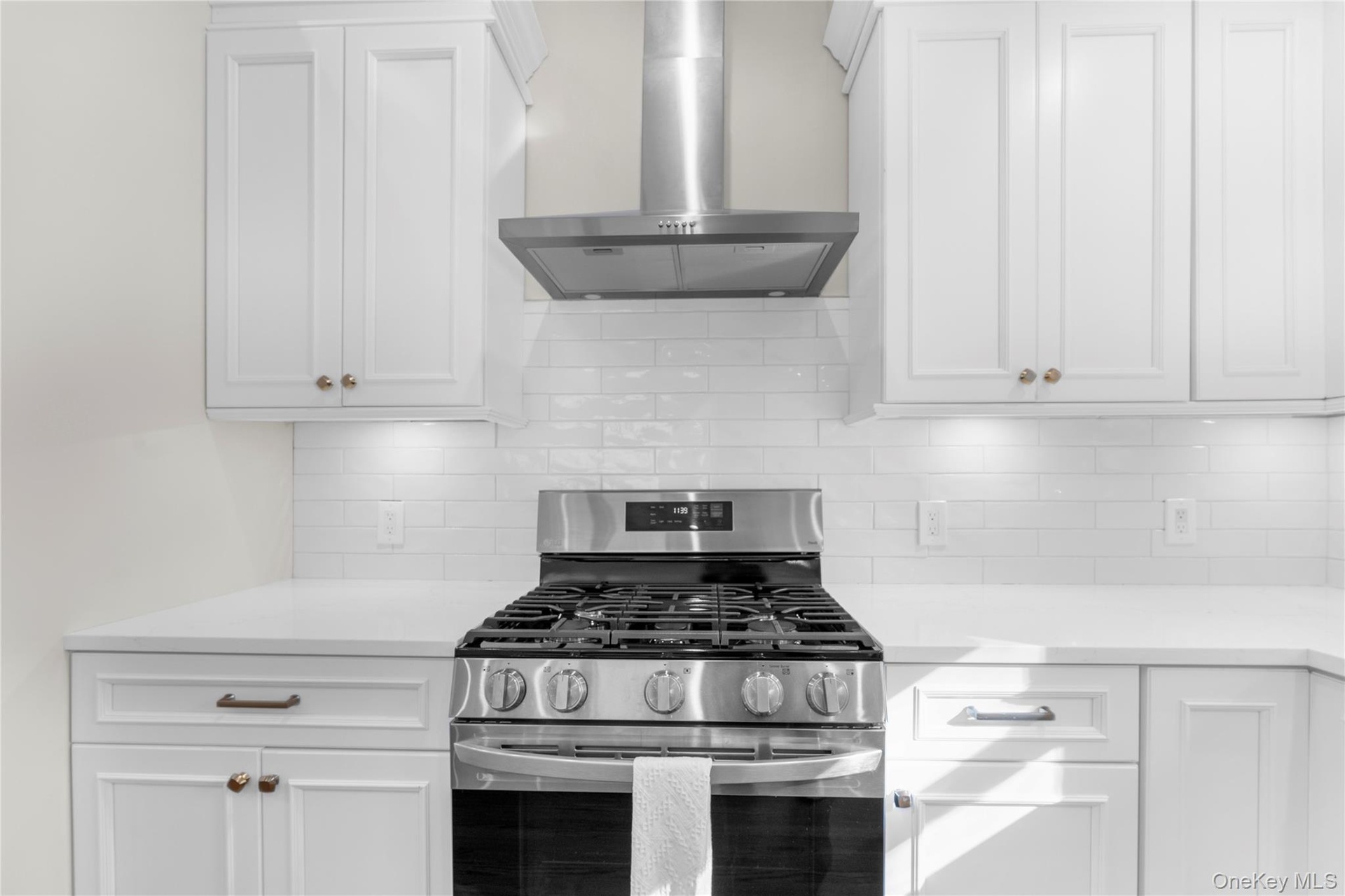 - Kitchen featuring stainless steel gas stove, wall chimney exhaust hood, white cabinets, backsplash, and light stone countertops