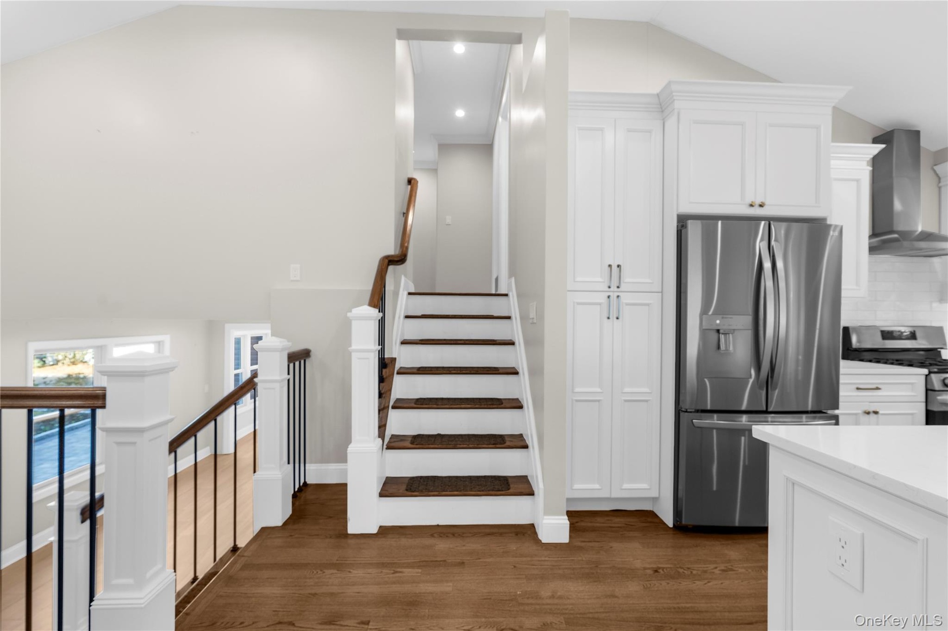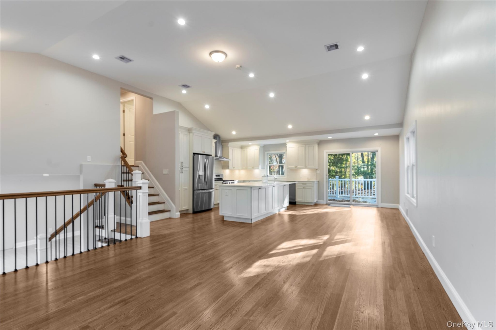 - Unfurnished living room featuring vaulted ceiling, stairs, light wood finished floors, and recessed lighting