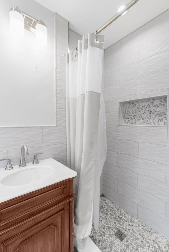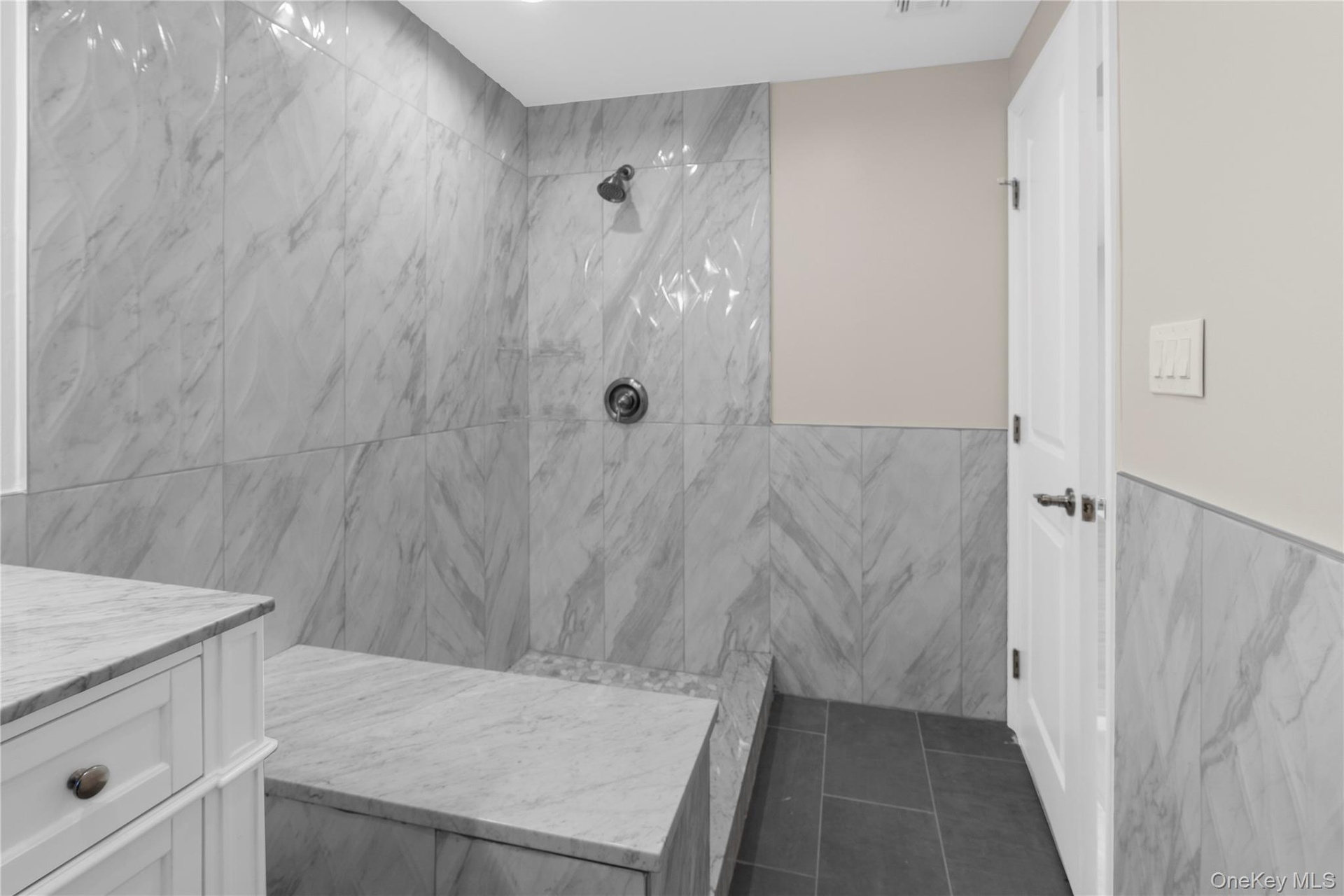 - Full bath with tile walls, a marble finish shower, dark tile patterned flooring, vanity, and a wainscoted wall