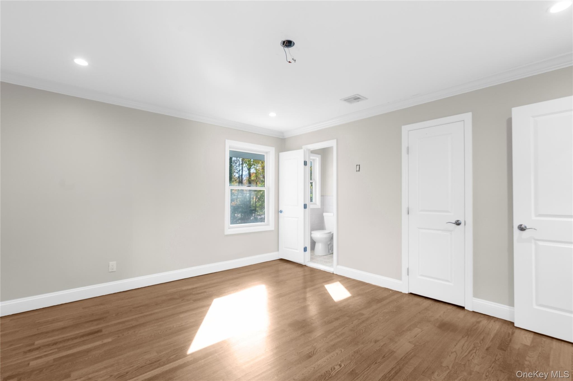 - Unfurnished bedroom featuring wood finished floors, crown molding, recessed lighting, and ensuite bath