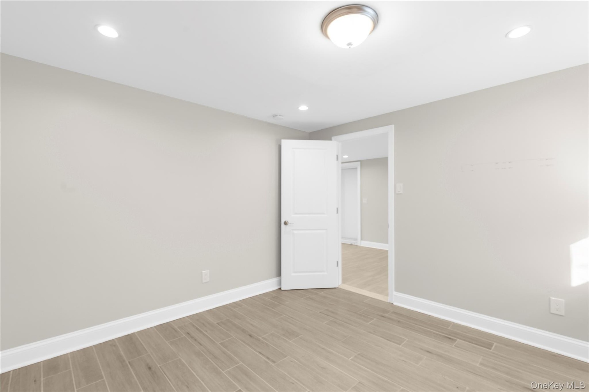 - Unfurnished room with recessed lighting, light wood-type flooring, and stairway