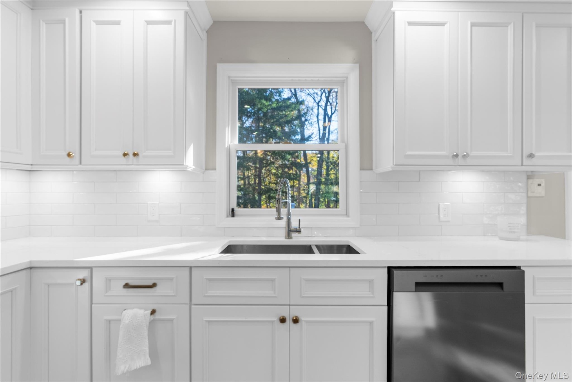 - Kitchen featuring stainless steel dishwasher and white cabinetry
