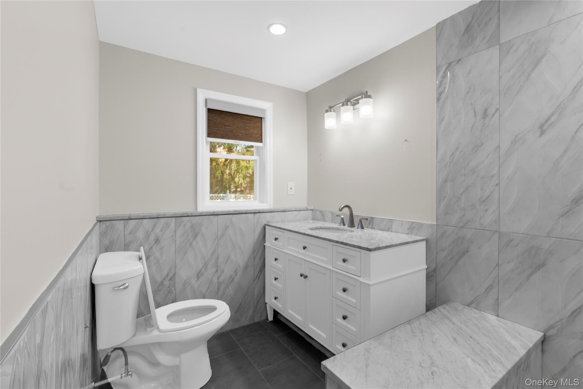 - Bathroom with tile walls, dark tile patterned floors, vanity, wainscoting, and recessed lighting