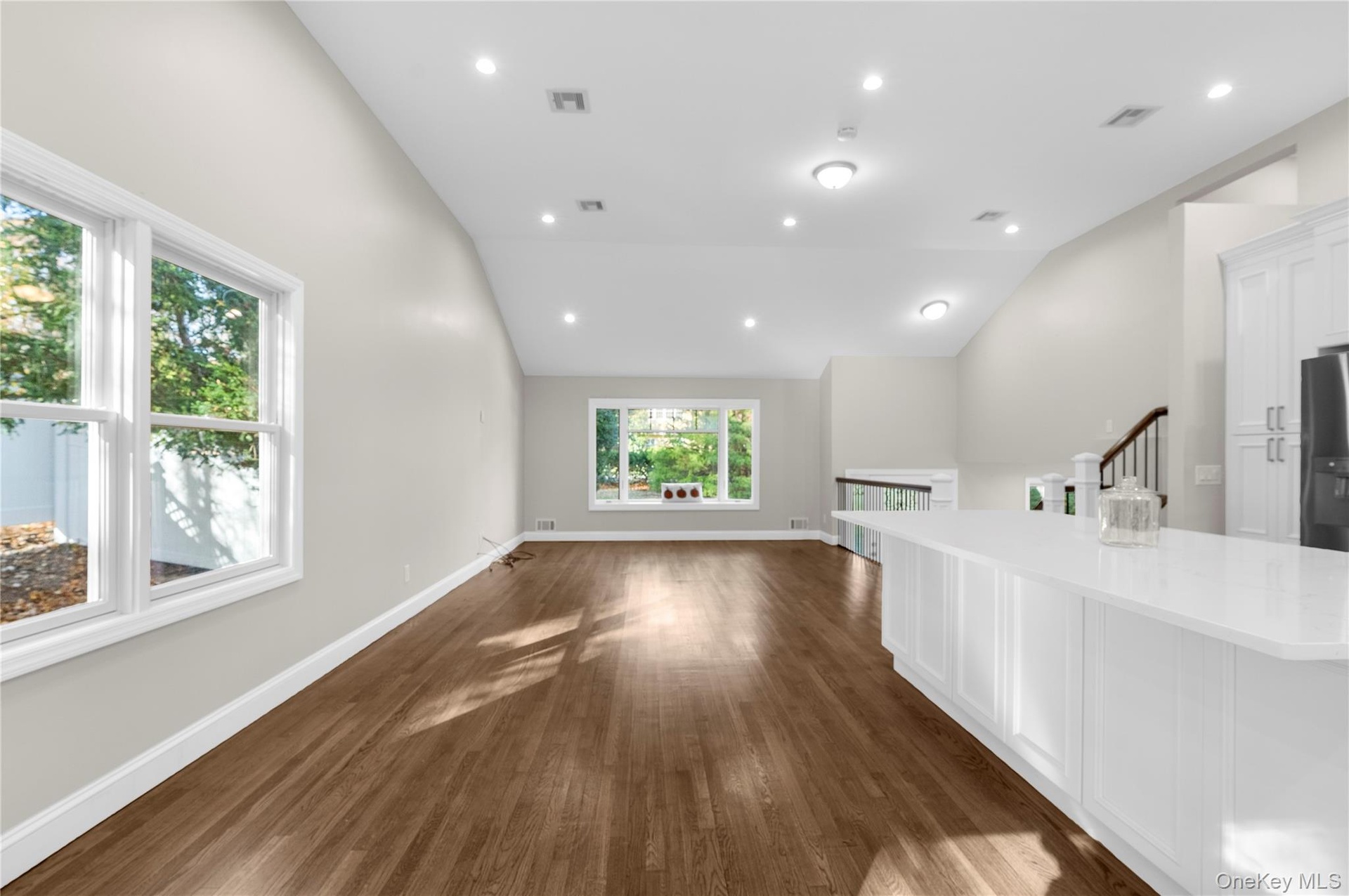 - Unfurnished living room with dark wood-style flooring, recessed lighting, and lofted ceiling